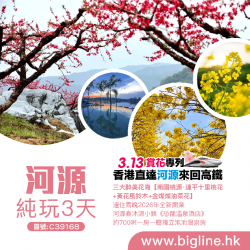 【3.13香港直達河源高鐵賞花專列】嶺南兩大醉美花海 一年一度『萬畝夢幻桃花源』 『金黃油菜花』河源【葉園溫泉度假酒店】尊享房間獨立溫泉泡池 任浸60多個天然蘇打泉 純玩3天