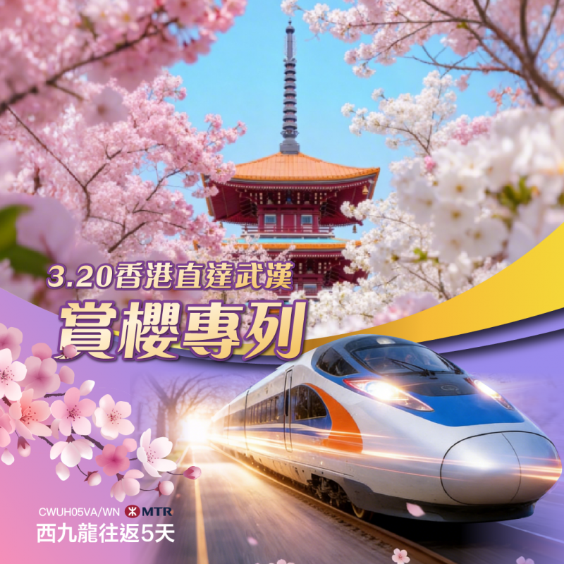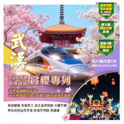 3.20香港直達武漢 賞櫻專列。【世界級賞櫻地武漢+中式美學奇幻夜】「東湖櫻園」 木蘭花鄉 <非遺鐵花 放飛孔明燈> 夜遊長江 (蔡甸油菜花海&武漢花博匯) 黃鶴樓 4晚連住國際品牌 西九龍往返5天