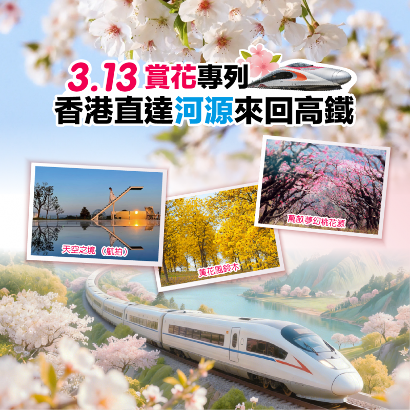 【3.13香港直達河源高鐵賞花專列】三大花海【南國桃源·連平十里桃花+黃花風鈴木+金燦燦油菜花】連住兩晚2026年全新開業河源春沐源小鎮《恐龍溫泉酒店》約700呎一房一廳獨立泡池房 純玩3天