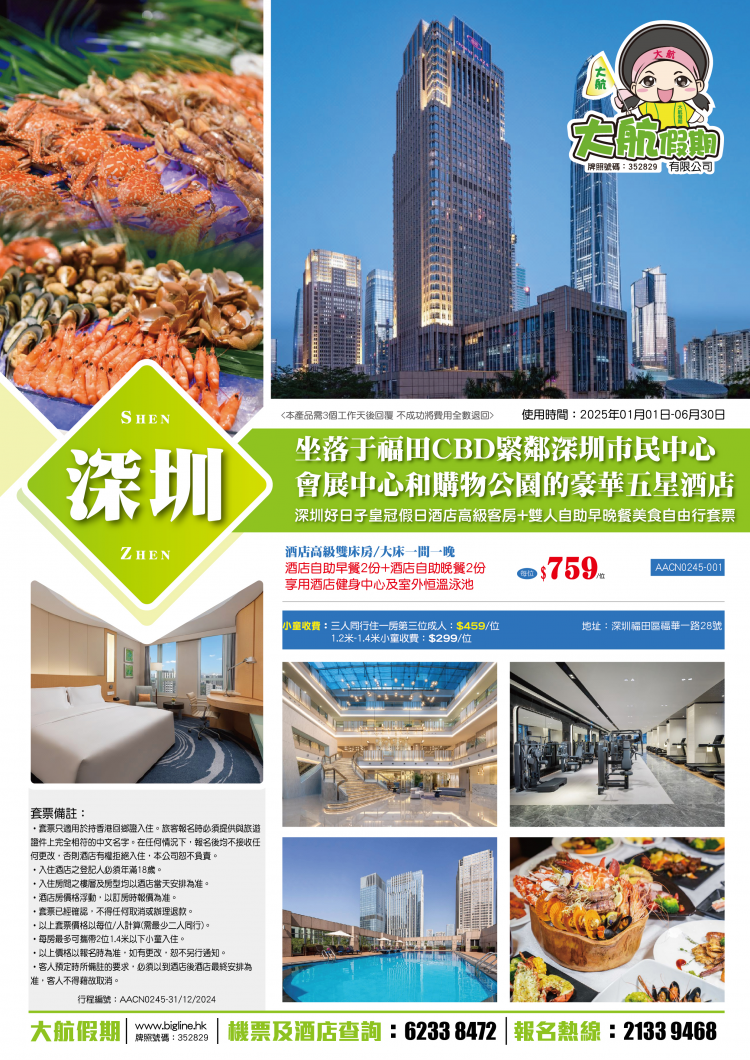 深圳好日子皇冠假日酒店客房+雙人自助早晚餐美食自由行套票$839/位起
