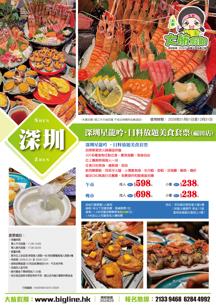 5.套票僅1人使用,身高1米以下兒童免費,每桌限帶1位,身高1-1.4米兒童收費標準為$238/位,1.4米及以上兒童按成人價收費.