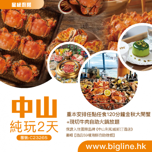 C23265 - 【星級廚房】重本安排任點任食120分鐘金秋大閘蟹+現切牛肉自助火鍋放題 保證入住國際品牌《中山利和威斯汀酒店》豪嘆【酒店59樓海鮮自助晚餐】純玩2天