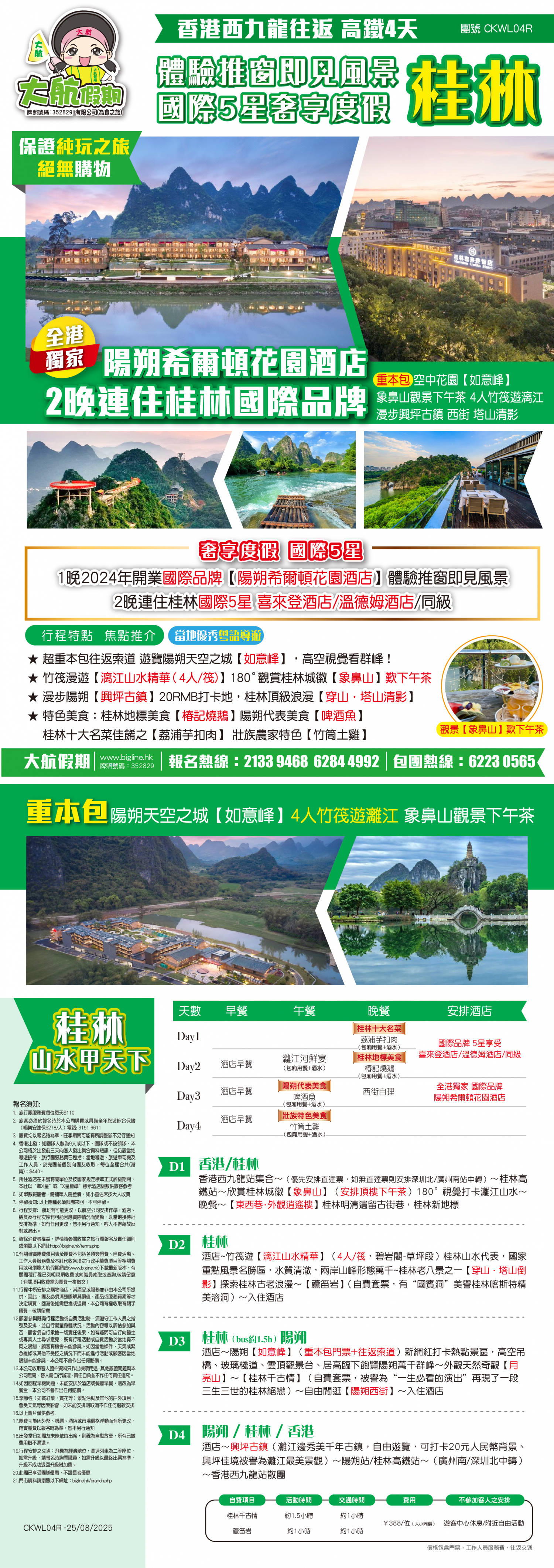 香港往返桂林【全港獨家·陽朔希爾頓花園酒店】2晚連住桂林(國際品牌酒店) 重本包空中花園【如意峰】<4人竹筏遊灕江>象鼻山觀景下午茶 興坪古鎮 西街 塔山清影 高鐵純玩4天