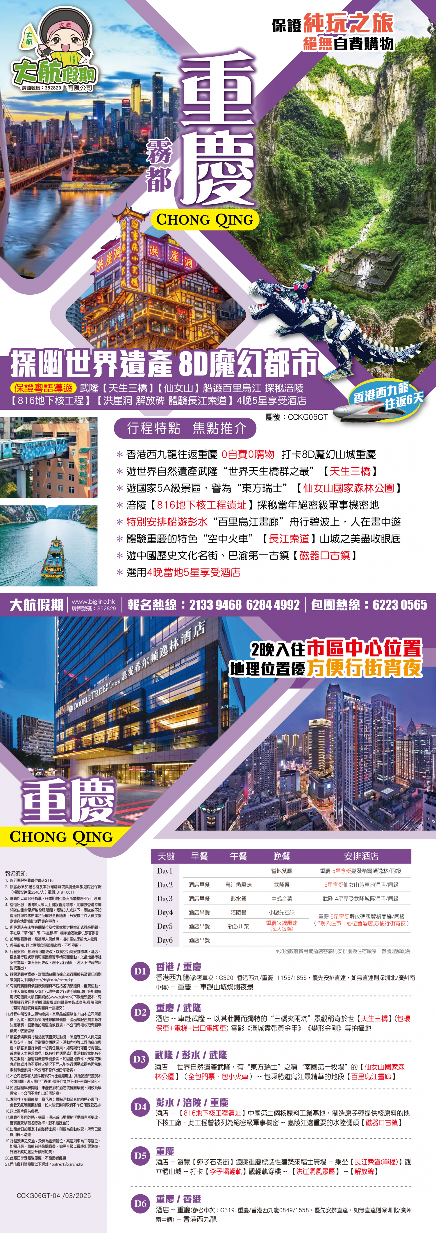 *團員繳付退票費後 (如適用): 1) 已繳款項可保留半年; 或 2) 選擇轉團後, 餘款則保留半年; 或 3) 可繳付『迫不得已理由』之手續費後, 取回已付餘款。 *個別機票+酒店套票產品如因『迫不得已理由』取消外遊行程, 處理旅客退款時亦按以上訂列收取每位退票費及手續費, 並以行程表 (套票單張) 所列為準。 責任細則: 1. 本公司保留合併團隊出發的權利。 2. 行程書或單張內所列費用根據當時機票價格及國際貨幣兌換率而訂立。外幣浮動等情況之下, 本公司保留在出發前調整各項費用的權利及徵收額外費用。 3. 所有列出的交通服務資料只供參考, 如有更改概不負責, 一切須以出票時為準。 4. 除本公司直接提供之服務外, 本公司及其職員或附屬公司或與本公司有經營關係之公司代理人身份在香港或外地安排其他獨立機構所提供之交通工具 (如飛機、輪船、火車、或遊覽巴士等) 、住宿、膳食或娛樂觀光項目等 (“委託機構”), 團員如遇交通延誤、行李遺失、意外傷亡或財物損失等, 該依照當地法律向擁有、管理或操作之委託機構直接交涉或追討賠償, 通常該等機構均各訂位不同條例, 以對客人負責。在此情況下, 本公司概不對該等損失或傷亡負責。 5. 除因由本公司之員工或其他直接管理或操作之機構之疏忽而引致團員之個人傷亡外, 本公司對團員在任何意外中之個人傷亡、經濟、娛樂或精神損失概不負責。 6. 除經本公司同意及安排, 如團員自行更改由其他人士代為參團, 本公司或其委託機構之職員有權取消其隨團之資格, 而無須發還任何團費, 而該人士在隨團期間之保險、責任賠償、行為後果等均由該人仕自行承擔。 7. 如因天氣、罷工、戰爭、怠工或安全情況影響而引致有關交通工具暫停服務, 停航或其他事故, 而必須將行程更改或取消部份行程, 本公司則將團員所繳交之費用扣除因以上事故而引致之損失後, 退回差額給團員。 8. 有關住宿、膳食、遊覽節目等問題, 均依據行程表安排, 行程先後次序有可能需要更改, 一切以當地安排為準。若遇特殊情況, 如簽證受阻, 當地酒店突告客滿或航機改變飛行時間或地點, 以及非本公司或其委託機構所能控制之因素, 令旅行團節目有增減, 或臨時更改交通工具、班機時間、機種及更換酒店等等, 本公司或其委託機構得依當時情況全權盡力處理, 團員不得藉故反對或退出, 因故取消之節目, 將不獲退還款項, 任何因延期而引致之額外支出, 本公司或其委託機構概不負責。 9. 所有酒店及住宿根據行程安排, 本公司視乎當時情形作出更改, 但不限於遇展覽會或特殊情況下, 將住宿鄰近城市之同等級酒店及住宿代替。本公司如因『迫不得已理由(外遊)』(即指戰爭、政治動盪、恐怖襲擊、天災、疫症、惡劣天氣、交通工具發生技術問題、載運機構臨時更改班次或取消服務、罷工、工業行動、旅遊目的地政府或世界衛生組織發出旅遊警示(警告)、香港特別行政區政府發出紅色或黑色外遊警示、不可抗力事件,以及業界不能控制的其他不利離開香港或在香港境外旅遊的情況)於外遊旅行團出發後更改任何項目而引致成本增加,可向顧客徵收額外費用。 10. 【已成團】代表該團號之指定出發日期預訂機位或已有足夠人數報名參加。但出發與否還受其他因素影響, 本公司保留最終決定權。 11. 任何團員在參與各項活動時, 如經常不遵守服飾人員之指引或安排, 在行動或言語上侮辱或滋擾其他團員或工作人員, 本公司或其委託機構職員有權視具體情況而取消其隨團資格而母須發任何團費, 而受該旅客監護之18歲以下同行團員亦須一併離開, 有關旅客離團後一切活動, 概與本公司或其委託機構無關。 12. 團員如欲於旅程完畢後延期返港, 須於出發前十四天提出, 以便本公司代為預定返港機位, 延期返港之機位, 未能即時作實, 團員不得藉此理由要求退出, 旅程完畢後延期逗留之費用, 概由團員自負。 13. 延期返港之團友, 必須在離境前七十二小時向航空公司確實回程機位, 任何機位如有變更, 概與本公司無關。 14. 團員如在旅途中自行離團或放棄行程, 離團後之責任自負, 一切後果與本公司或其委託機構無關。 15. 參團者須切實遵守各國及各地法例, 包括但不限於防疫防控條例, 並嚴禁攜帶違例物品出入境, 並照實申報攜帶之物品及現金。 16. 任何種類的簽證審批權及出入境批准權一律由該國或地區之領事館及/或出入境部門全權決定, 出入境如有問題, 責任旅客自負, 本公司或其委託機構母須負任何責任。如簽證已代辦, 簽證費恕不退還。 17. 即使團員持有效之入境簽證及旅遊證件, 而於入境時被當值之移民局海關人員拒絕入境, 本公司或其委託機構亦無須負任何責任。所需額外安排之食宿、交通費用、全部由其本人負責, 其餘下的行程亦將不會獲得任何補償, 亦不得要求退款或改團。 18. 中國內地相關法規規定, 即日起旅客入住中國內地境內酒店時, 公安機關會透過酒店前台向旅客一併採集人像信息資訊。 19. 如出現一些非本公司能力範圍可控制之問題 (如花卉、紅葉提早凋謝或景觀、自然現象、景點活動或戶外項目) 會受天氣等因素影響, 如未能安排則取消不作任何退款安排。 20. 旅客如在旅程中確診 COVID-19或其他傳染病,無論受到當地政府隔離或其他檢疫要求影響與否,為確保其他旅客之安全,確診旅