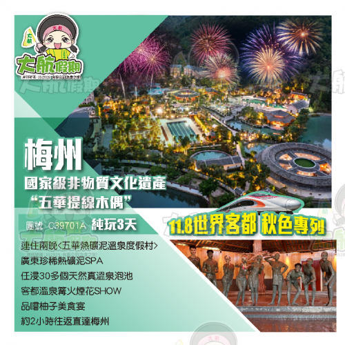 | 第2天 | 酒店自助早餐 | 客鄉金秋柚子宴 | 客家招牌鹽焗雞宴 | 五華熱礦泥溫泉度假村 |