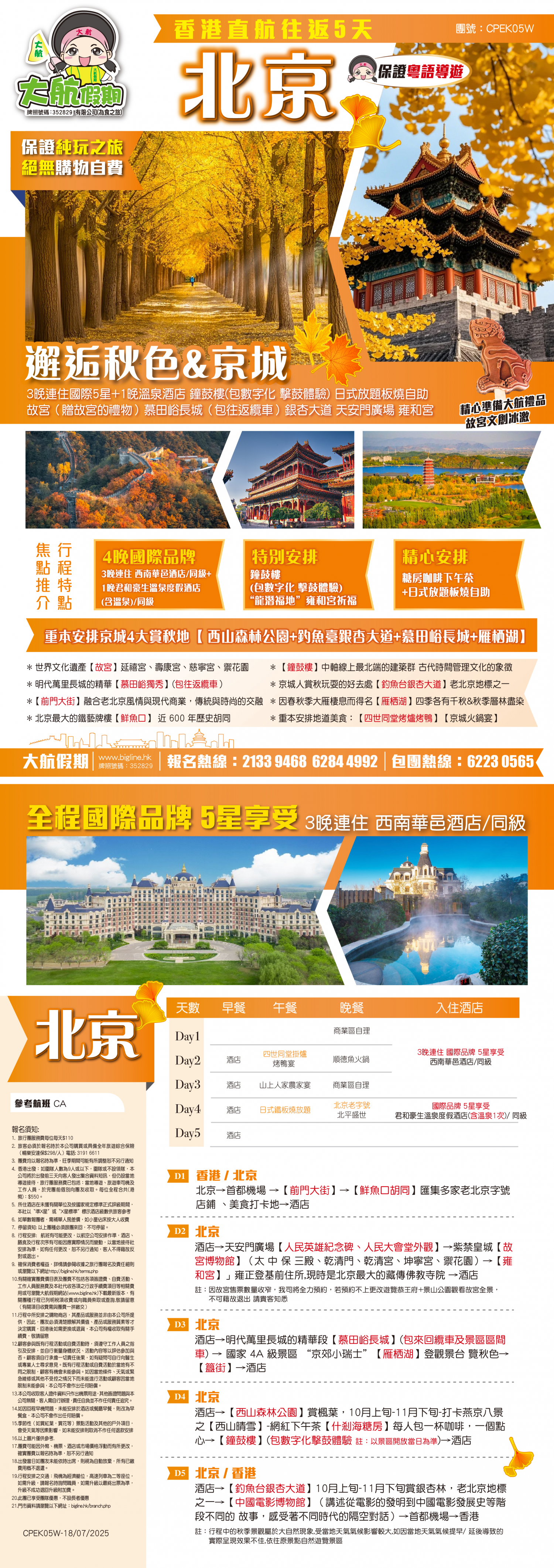 D5 酒店→【釣魚台銀杏大道】10月上旬-11月 下旬賞銀杏林-老北京地標之一→【中國電影博物館】(講述從電影的發明到中國電影發展史等階段不同的 故事,感受著不同時代的隔空對話)→首都機場→香港
