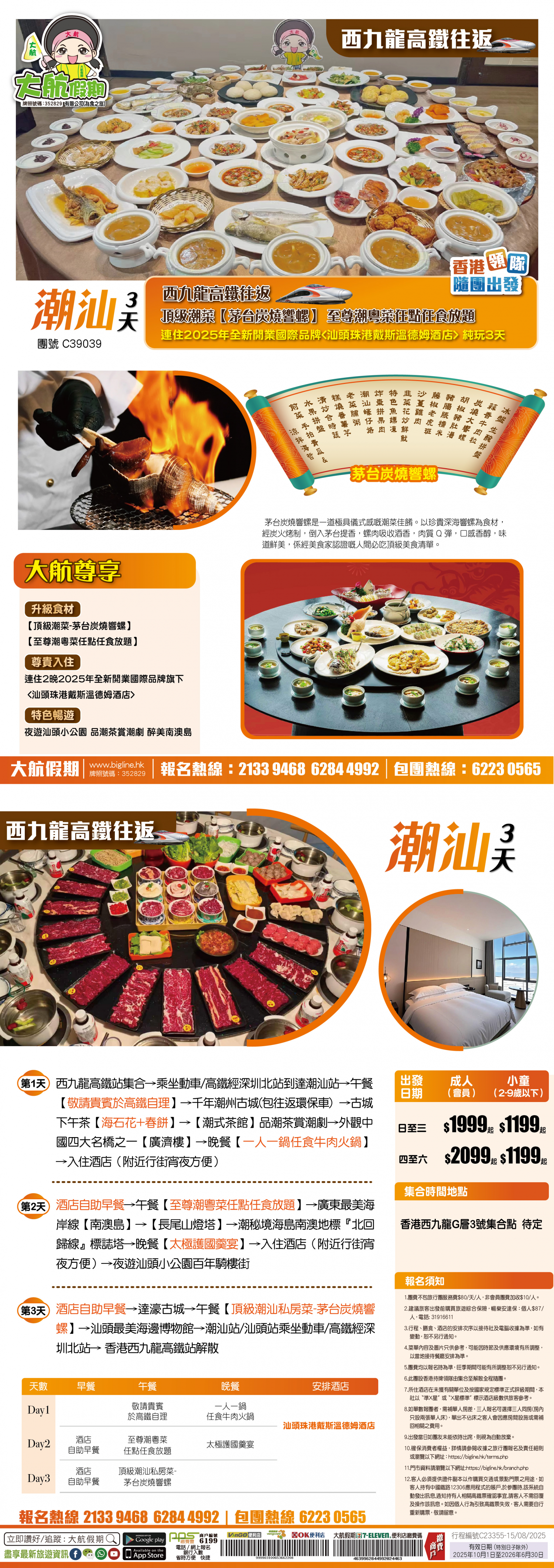 【西九龍高鐵往返】潮汕星級廚房 頂級潮菜【茅台炭燒響螺】 至尊潮粵菜任點任食放題 連住2晚2025年全新開業國際品牌旗下【汕頭珠港戴斯溫德姆酒店】 純玩3天