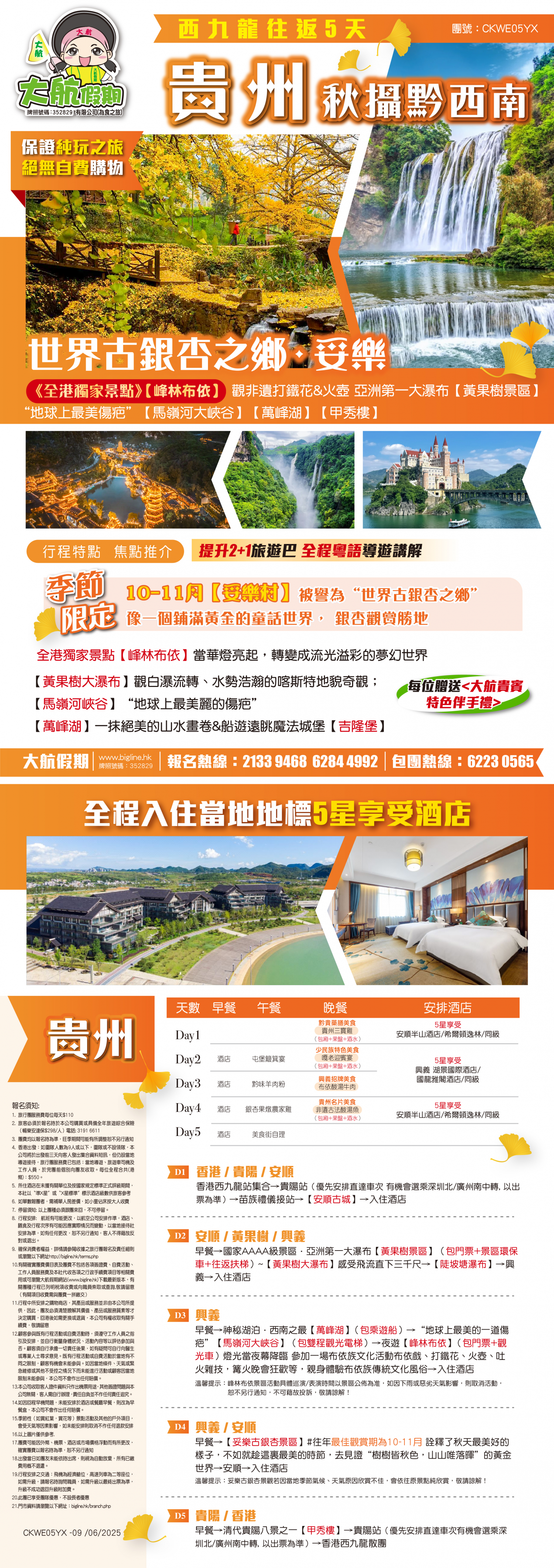 *團員繳付退票費後 (如適用): 1) 已繳款項可保留半年; 或 2) 選擇轉團後, 餘款則保留半年; 或 3) 可繳付『迫不得已理由』之手續費後, 取回已付餘款。 *個別機票+酒店套票產品如因『迫不得已理由』取消外遊行程, 處理旅客退款時亦按以上訂列收取每位退票費及手續費, 並以行程表 (套票單張) 所列為準。 責任細則: 1. 本公司保留合併團隊出發的權利。 2. 行程書或單張內所列費用根據當時機票價格及國際貨幣兌換率而訂立。外幣浮動等情況之下, 本公司保留在出發前調整各項費用的權利及徵收額外費用。 3. 所有列出的交通服務資料只供參考, 如有更改概不負責, 一切須以出票時為準。 4. 除本公司直接提供之服務外, 本公司及其職員或附屬公司或與本公司有經營關係之公司代理人身份在香港或外地安排其他獨立機構所提供之交通工具 (如飛機、輪船、火車、或遊覽巴士等) 、住宿、膳食或娛樂觀光項目等 (“委託機構”), 團員如遇交通延誤、行李遺失、意外傷亡或財物損失等, 該依照當地法律向擁有、管理或操作之委託機構直接交涉或追討賠償, 通常該等機構均各訂位不同條例, 以對客人負責。在此情況下, 本公司概不對該等損失或傷亡負責。 5. 除因由本公司之員工或其他直接管理或操作之機構之疏忽而引致團員之個人傷亡外, 本公司對團員在任何意外中之個人傷亡、經濟、娛樂或精神損失概不負責。 6. 除經本公司同意及安排, 如團員自行更改由其他人士代為參團, 本公司或其委託機構之職員有權取消其隨團之資格, 而無須發還任何團費, 而該人士在隨團期間之保險、責任賠償、行為後果等均由該人仕自行承擔。 7. 如因天氣、罷工、戰爭、怠工或安全情況影響而引致有關交通工具暫停服務, 停航或其他事故, 而必須將行程更改或取消部份行程, 本公司則將團員所繳交之費用扣除因以上事故而引致之損失後, 退回差額給團員。 8. 有關住宿、膳食、遊覽節目等問題, 均依據行程表安排, 行程先後次序有可能需要更改, 一切以當地安排為準。若遇特殊情況, 如簽證受阻, 當地酒店突告客滿或航機改變飛行時間或地點, 以及非本公司或其委託機構所能控制之因素, 令旅行團節目有增減, 或臨時更改交通工具、班機時間、機種及更換酒店等等, 本公司或其委託機構得依當時情況全權盡力處理, 團員不得藉故反對或退出, 因故取消之節目, 將不獲退還款項, 任何因延期而引致之額外支出, 本公司或其委託機構概不負責。 9. 所有酒店及住宿根據行程安排, 本公司視乎當時情形作出更改, 但不限於遇展覽會或特殊情況下, 將住宿鄰近城市之同等級酒店及住宿代替。本公司如因『迫不得已理由(外遊)』(即指戰爭、政治動盪、恐怖襲擊、天災、疫症、惡劣天氣、交通工具發生技術問題、載運機構臨時更改班次或取消服務、罷工、工業行動、旅遊目的地政府或世界衛生組織發出旅遊警示(警告)、香港特別行政區政府發出紅色或黑色外遊警示、不可抗力事件,以及業界不能控制的其他不利離開香港或在香港境外旅遊的情況)於外遊旅行團出發後更改任何項目而引致成本增加,可向顧客徵收額外費用。 10. 【已成團】代表該團號之指定出發日期預訂機位或已有足夠人數報名參加。但出發與否還受其他因素影響, 本公司保留最終決定權。 11. 任何團員在參與各項活動時, 如經常不遵守服飾人員之指引或安排, 在行動或言語上侮辱或滋擾其他團員或工作人員, 本公司或其委託機構職員有權視具體情況而取消其隨團資格而母須發任何團費, 而受該旅客監護之18歲以下同行團員亦須一併離開, 有關旅客離團後一切活動, 概與本公司或其委託機構無關。 12. 團員如欲於旅程完畢後延期返港, 須於出發前十四天提出, 以便本公司代為預定返港機位, 延期返港之機位, 未能即時作實, 團員不得藉此理由要求退出, 旅程完畢後延期逗留之費用, 概由團員自負。 13. 延期返港之團友, 必須在離境前七十二小時向航空公司確實回程機位, 任何機位如有變更, 概與本公司無關。 14. 團員如在旅途中自行離團或放棄行程, 離團後之責任自負, 一切後果與本公司或其委託機構無關。 15. 參團者須切實遵守各國及各地法例, 包括但不限於防疫防控條例, 並嚴禁攜帶違例物品出入境, 並照實申報攜帶之物品及現金。 16. 任何種類的簽證審批權及出入境批准權一律由該國或地區之領事館及/或出入境部門全權決定, 出入境如有問題, 責任旅客自負, 本公司或其委託機構母須負任何責任。如簽證已代辦, 簽證費恕不退還。 17. 即使團員持有效之入境簽證及旅遊證件, 而於入境時被當值之移民局海關人員拒絕入境, 本公司或其委託機構亦無須負任何責任。所需額外安排之食宿、交通費用、全部由其本人負責, 其餘下的行程亦將不會獲得任何補償, 亦不得要求退款或改團。 18. 中國內地相關法規規定, 即日起旅客入住中國內地境內酒店時, 公安機關會透過酒店前台向旅客一併採集人像信息資訊。 19. 如出現一些非本公司能力範圍可控制之問題 (如花卉、紅葉提早凋謝或景觀、自然現象、景點活動或戶外項目) 會受天氣等因素影響, 如未能安排則取消不作任何退款安排。 20. 旅客如在旅程中確診 COVID-19或其他傳染病,無論受到當地政府隔離或其他檢疫要求影響與否,為確保其他旅客之安全,確診旅