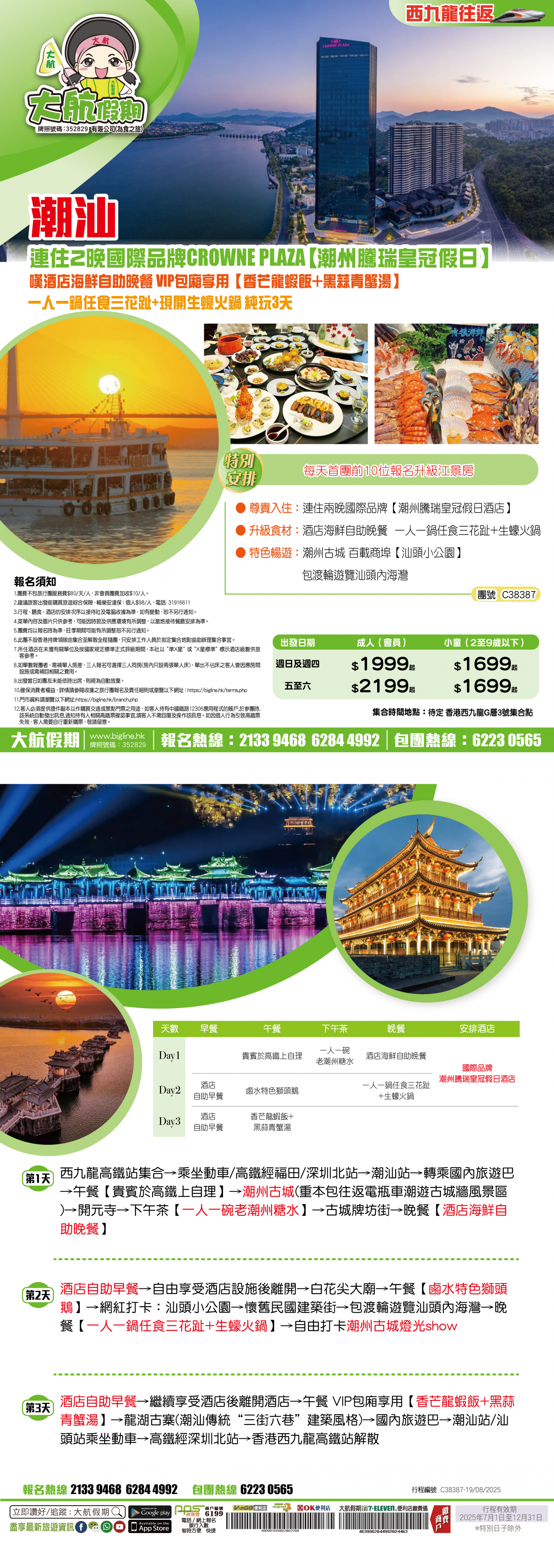 | 第1天 | 客人自理 | 潮州騰瑞皇冠假日酒店 | ||