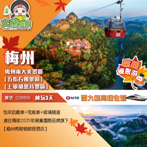 【西九龍高鐵往返】梅州美景遊 重本包門票【五指石風景區】(包來回纜車+電瓶車+玻璃棧道)上舉相思谷瀑布群 連住兩晚2025年開業國際品牌旗下【梅州希爾頓歡朋酒店】純玩3天