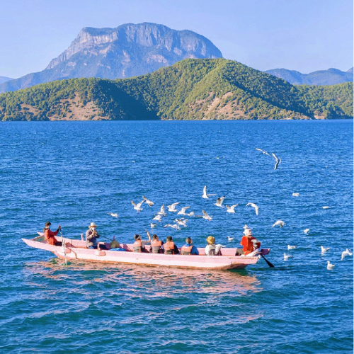 酒店~到碼頭乘坐摩梭人獨特的水上交通【豬槽船】~湛蓝瀘沽湖上的一滴眼泪【里格半島】~登上【里務比島】~(BUS約3.5h)麗江~邂逅夜色古城【麗江古城·四方街放河燈】