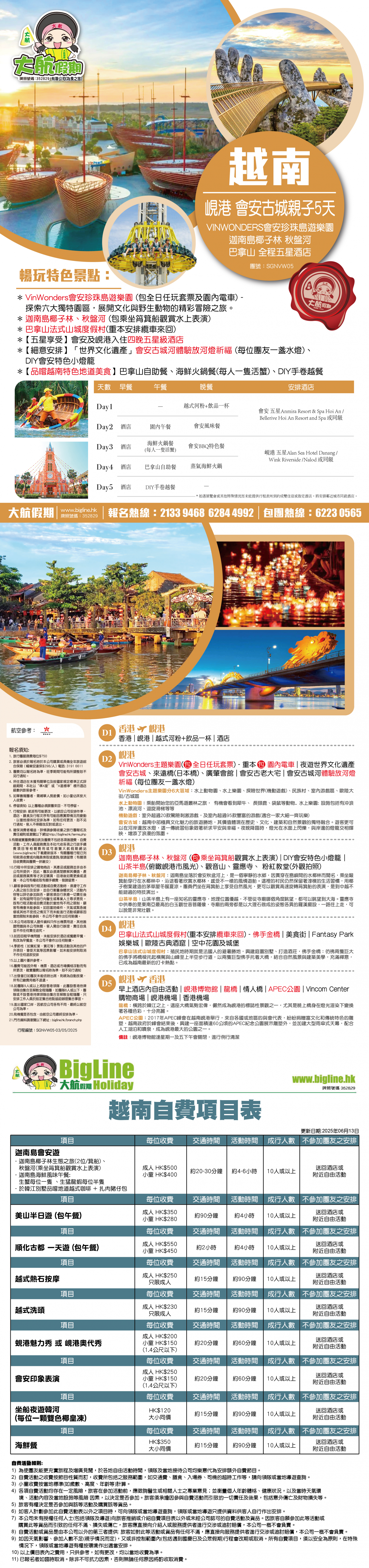 *團員繳付退票費後 (如適用): 1) 已繳款項可保留半年; 或 2) 選擇轉團後, 餘款則保留半年; 或 3) 可繳付『迫不得已理由』之手續費後, 取回已付餘款。 *個別機票+酒店套票產品如因『迫不得已理由』取消外遊行程, 處理旅客退款時亦按以上訂列收取每位退票費及手續費, 並以行程表 (套票單張) 所列為準。 責任細則: 1. 本公司保留合併團隊出發的權利。 2. 行程書或單張內所列費用根據當時機票價格及國際貨幣兌換率而訂立。外幣浮動等情況之下, 本公司保留在出發前調整各項費用的權利及徵收額外費用。 3. 所有列出的交通服務資料只供參考, 如有更改概不負責, 一切須以出票時為準。 4. 除本公司直接提供之服務外, 本公司及其職員或附屬公司或與本公司有經營關係之公司代理人身份在香港或外地安排其他獨立機構所提供之交通工具 (如飛機、輪船、火車、或遊覽巴士等) 、住宿、膳食或娛樂觀光項目等 (“委託機構”), 團員如遇交通延誤、行李遺失、意外傷亡或財物損失等, 該依照當地法律向擁有、管理或操作之委託機構直接交涉或追討賠償, 通常該等機構均各訂位不同條例, 以對客人負責。在此情況下, 本公司概不對該等損失或傷亡負責。 5. 除因由本公司之員工或其他直接管理或操作之機構之疏忽而引致團員之個人傷亡外, 本公司對團員在任何意外中之個人傷亡、經濟、娛樂或精神損失概不負責。 6. 除經本公司同意及安排, 如團員自行更改由其他人士代為參團, 本公司或其委託機構之職員有權取消其隨團之資格, 而無須發還任何團費, 而該人士在隨團期間之保險、責任賠償、行為後果等均由該人仕自行承擔。 7. 如因天氣、罷工、戰爭、怠工或安全情況影響而引致有關交通工具暫停服務, 停航或其他事故, 而必須將行程更改或取消部份行程, 本公司則將團員所繳交之費用扣除因以上事故而引致之損失後, 退回差額給團員。 8. 有關住宿、膳食、遊覽節目等問題, 均依據行程表安排, 行程先後次序有可能需要更改, 一切以當地安排為準。若遇特殊情況, 如簽證受阻, 當地酒店突告客滿或航機改變飛行時間或地點, 以及非本公司或其委託機構所能控制之因素, 令旅行團節目有增減, 或臨時更改交通工具、班機時間、機種及更換酒店等等, 本公司或其委託機構得依當時情況全權盡力處理, 團員不得藉故反對或退出, 因故取消之節目, 將不獲退還款項, 任何因延期而引致之額外支出, 本公司或其委託機構概不負責。 9. 所有酒店及住宿根據行程安排, 本公司視乎當時情形作出更改, 但不限於遇展覽會或特殊情況下, 將住宿鄰近城市之同等級酒店及住宿代替。本公司如因『迫不得已理由(外遊)』(即指戰爭、政治動盪、恐怖襲擊、天災、疫症、惡劣天氣、交通工具發生技術問題、載運機構臨時更改班次或取消服務、罷工、工業行動、旅遊目的地政府或世界衛生組織發出旅遊警示(警告)、香港特別行政區政府發出紅色或黑色外遊警示、不可抗力事件,以及業界不能控制的其他不利離開香港或在香港境外旅遊的情況)於外遊旅行團出發後更改任何項目而引致成本增加,可向顧客徵收額外費用。 10. 【已成團】代表該團號之指定出發日期預訂機位或已有足夠人數報名參加。但出發與否還受其他因素影響, 本公司保留最終決定權。 11. 任何團員在參與各項活動時, 如經常不遵守服飾人員之指引或安排, 在行動或言語上侮辱或滋擾其他團員或工作人員, 本公司或其委託機構職員有權視具體情況而取消其隨團資格而母須發任何團費, 而受該旅客監護之18歲以下同行團員亦須一併離開, 有關旅客離團後一切活動, 概與本公司或其委託機構無關。 12. 團員如欲於旅程完畢後延期返港, 須於出發前十四天提出, 以便本公司代為預定返港機位, 延期返港之機位, 未能即時作實, 團員不得藉此理由要求退出, 旅程完畢後延期逗留之費用, 概由團員自負。 13. 延期返港之團友, 必須在離境前七十二小時向航空公司確實回程機位, 任何機位如有變更, 概與本公司無關。 14. 團員如在旅途中自行離團或放棄行程, 離團後之責任自負, 一切後果與本公司或其委託機構無關。 15. 參團者須切實遵守各國及各地法例, 包括但不限於防疫防控條例, 並嚴禁攜帶違例物品出入境, 並照實申報攜帶之物品及現金。 16. 任何種類的簽證審批權及出入境批准權一律由該國或地區之領事館及/或出入境部門全權決定, 出入境如有問題, 責任旅客自負, 本公司或其委託機構母須負任何責任。如簽證已代辦, 簽證費恕不退還。 17. 即使團員持有效之入境簽證及旅遊證件, 而於入境時被當值之移民局海關人員拒絕入境, 本公司或其委託機構亦無須負任何責任。所需額外安排之食宿、交通費用、全部由其本人負責, 其餘下的行程亦將不會獲得任何補償, 亦不得要求退款或改團。 18. 中國內地相關法規規定, 即日起旅客入住中國內地境內酒店時, 公安機關會透過酒店前台向旅客一併採集人像信息資訊。 19. 如出現一些非本公司能力範圍可控制之問題 (如花卉、紅葉提早凋謝或景觀、自然現象、景點活動或戶外項目) 會受天氣等因素影響, 如未能安排則取消不作任何退款安排。 20. 旅客如在旅程中確診 COVID-19或其他傳染病,無論受到當地政府隔離或其他檢疫要求影響與否,為確保其他旅客之安全,確診旅