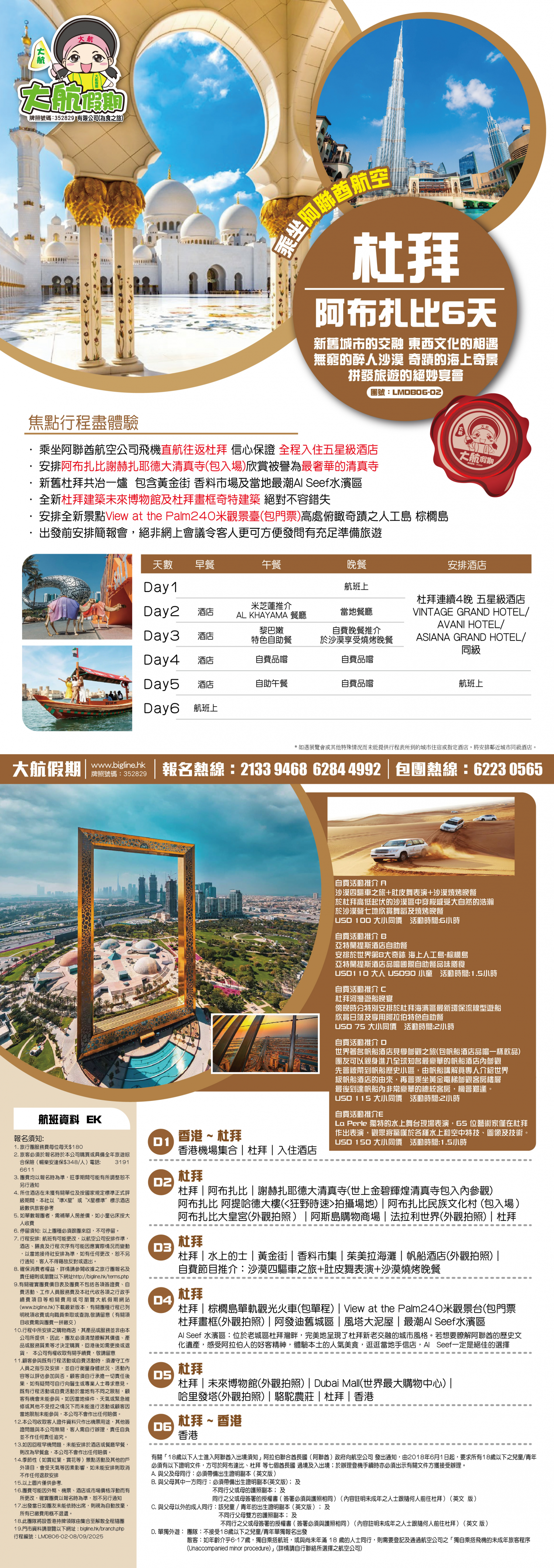 *團員繳付退票費後 (如適用): 1) 已繳款項可保留半年; 或 2) 選擇轉團後, 餘款則保留半年; 或 3) 可繳付『迫不得已理由』之手續費後, 取回已付餘款。 *個別機票+酒店套票產品如因『迫不得已理由』取消外遊行程, 處理旅客退款時亦按以上訂列收取每位退票費及手續費, 並以行程表 (套票單張) 所列為準。 責任細則: 1. 本公司保留合併團隊出發的權利。 2. 行程書或單張內所列費用根據當時機票價格及國際貨幣兌換率而訂立。外幣浮動等情況之下, 本公司保留在出發前調整各項費用的權利及徵收額外費用。 3. 所有列出的交通服務資料只供參考, 如有更改概不負責, 一切須以出票時為準。 4. 除本公司直接提供之服務外, 本公司及其職員或附屬公司或與本公司有經營關係之公司代理人身份在香港或外地安排其他獨立機構所提供之交通工具 (如飛機、輪船、火車、或遊覽巴士等) 、住宿、膳食或娛樂觀光項目等 (“委託機構”), 團員如遇交通延誤、行李遺失、意外傷亡或財物損失等, 該依照當地法律向擁有、管理或操作之委託機構直接交涉或追討賠償, 通常該等機構均各訂位不同條例, 以對客人負責。在此情況下, 本公司概不對該等損失或傷亡負責。 5. 除因由本公司之員工或其他直接管理或操作之機構之疏忽而引致團員之個人傷亡外, 本公司對團員在任何意外中之個人傷亡、經濟、娛樂或精神損失概不負責。 6. 除經本公司同意及安排, 如團員自行更改由其他人士代為參團, 本公司或其委託機構之職員有權取消其隨團之資格, 而無須發還任何團費, 而該人士在隨團期間之保險、責任賠償、行為後果等均由該人仕自行承擔。 7. 如因天氣、罷工、戰爭、怠工或安全情況影響而引致有關交通工具暫停服務, 停航或其他事故, 而必須將行程更改或取消部份行程, 本公司則將團員所繳交之費用扣除因以上事故而引致之損失後, 退回差額給團員。 8. 有關住宿、膳食、遊覽節目等問題, 均依據行程表安排, 行程先後次序有可能需要更改, 一切以當地安排為準。若遇特殊情況, 如簽證受阻, 當地酒店突告客滿或航機改變飛行時間或地點, 以及非本公司或其委託機構所能控制之因素, 令旅行團節目有增減, 或臨時更改交通工具、班機時間、機種及更換酒店等等, 本公司或其委託機構得依當時情況全權盡力處理, 團員不得藉故反對或退出, 因故取消之節目, 將不獲退還款項, 任何因延期而引致之額外支出, 本公司或其委託機構概不負責。 9. 所有酒店及住宿根據行程安排, 本公司視乎當時情形作出更改, 但不限於遇展覽會或特殊情況下, 將住宿鄰近城市之同等級酒店及住宿代替。本公司如因『迫不得已理由(外遊)』(即指戰爭、政治動盪、恐怖襲擊、天災、疫症、惡劣天氣、交通工具發生技術問題、載運機構臨時更改班次或取消服務、罷工、工業行動、旅遊目的地政府或世界衛生組織發出旅遊警示(警告)、香港特別行政區政府發出紅色或黑色外遊警示、不可抗力事件,以及業界不能控制的其他不利離開香港或在香港境外旅遊的情況)於外遊旅行團出發後更改任何項目而引致成本增加,可向顧客徵收額外費用。 10. 【已成團】代表該團號之指定出發日期預訂機位或已有足夠人數報名參加。但出發與否還受其他因素影響, 本公司保留最終決定權。 11. 任何團員在參與各項活動時, 如經常不遵守服飾人員之指引或安排, 在行動或言語上侮辱或滋擾其他團員或工作人員, 本公司或其委託機構職員有權視具體情況而取消其隨團資格而母須發任何團費, 而受該旅客監護之18歲以下同行團員亦須一併離開, 有關旅客離團後一切活動, 概與本公司或其委託機構無關。 12. 團員如欲於旅程完畢後延期返港, 須於出發前十四天提出, 以便本公司代為預定返港機位, 延期返港之機位, 未能即時作實, 團員不得藉此理由要求退出, 旅程完畢後延期逗留之費用, 概由團員自負。 13. 延期返港之團友, 必須在離境前七十二小時向航空公司確實回程機位, 任何機位如有變更, 概與本公司無關。 14. 團員如在旅途中自行離團或放棄行程, 離團後之責任自負, 一切後果與本公司或其委託機構無關。 15. 參團者須切實遵守各國及各地法例, 包括但不限於防疫防控條例, 並嚴禁攜帶違例物品出入境, 並照實申報攜帶之物品及現金。 16. 任何種類的簽證審批權及出入境批准權一律由該國或地區之領事館及/或出入境部門全權決定, 出入境如有問題, 責任旅客自負, 本公司或其委託機構母須負任何責任。如簽證已代辦, 簽證費恕不退還。 17. 即使團員持有效之入境簽證及旅遊證件, 而於入境時被當值之移民局海關人員拒絕入境, 本公司或其委託機構亦無須負任何責任。所需額外安排之食宿、交通費用、全部由其本人負責, 其餘下的行程亦將不會獲得任何補償, 亦不得要求退款或改團。 18. 中國內地相關法規規定, 即日起旅客入住中國內地境內酒店時, 公安機關會透過酒店前台向旅客一併採集人像信息資訊。 19. 如出現一些非本公司能力範圍可控制之問題 (如花卉、紅葉提早凋謝或景觀、自然現象、景點活動或戶外項目) 會受天氣等因素影響, 如未能安排則取消不作任何退款安排。 20. 旅客如在旅程中確診 COVID-19或其他傳染病,無論受到當地政府隔離或其他檢疫要求影響與否,為確保其他旅客之安全,確診旅