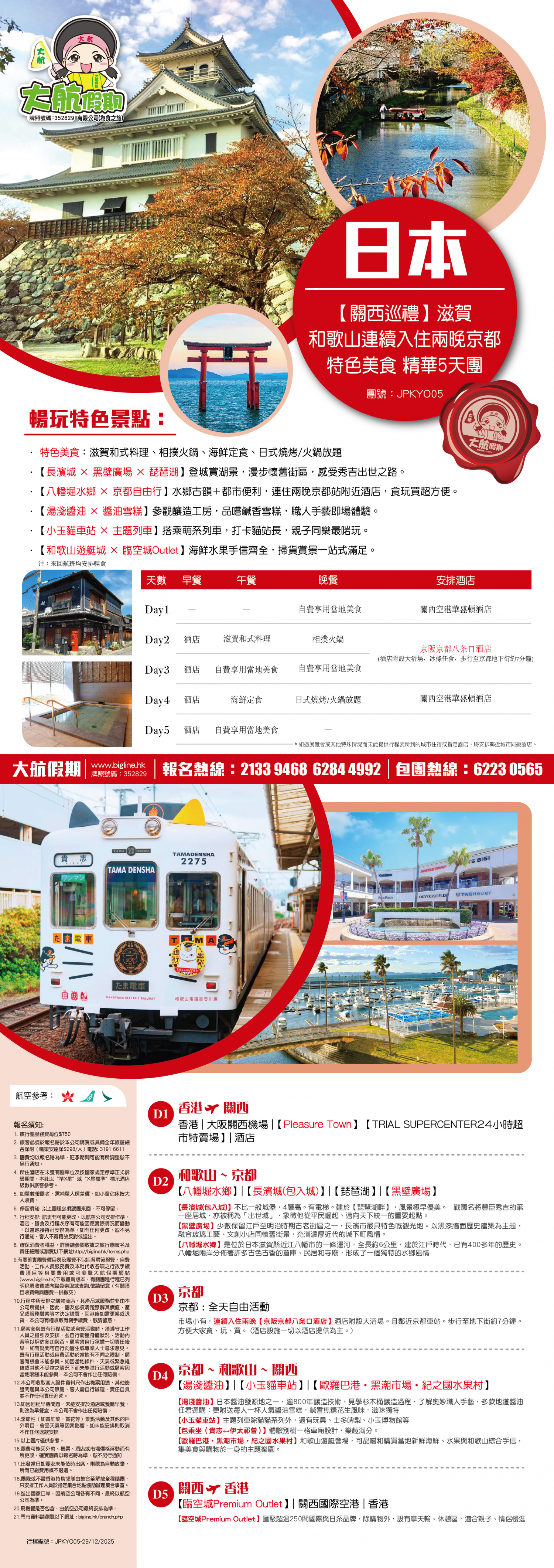 *團員繳付退票費後 (如適用): 1) 已繳款項可保留半年; 或 2) 選擇轉團後, 餘款則保留半年; 或 3) 可繳付『迫不得已理由』之手續費後, 取回已付餘款。 *個別機票+酒店套票產品如因『迫不得已理由』取消外遊行程, 處理旅客退款時亦按以上訂列收取每位退票費及手續費, 並以行程表 (套票單張) 所列為準。 責任細則: 1. 本公司保留合併團隊出發的權利。 2. 行程書或單張內所列費用根據當時機票價格及國際貨幣兌換率而訂立。外幣浮動等情況之下, 本公司保留在出發前調整各項費用的權利及徵收額外費用。 3. 所有列出的交通服務資料只供參考, 如有更改概不負責, 一切須以出票時為準。 4. 除本公司直接提供之服務外, 本公司及其職員或附屬公司或與本公司有經營關係之公司代理人身份在香港或外地安排其他獨立機構所提供之交通工具 (如飛機、輪船、火車、或遊覽巴士等) 、住宿、膳食或娛樂觀光項目等 (“委託機構”), 團員如遇交通延誤、行李遺失、意外傷亡或財物損失等, 該依照當地法律向擁有、管理或操作之委託機構直接交涉或追討賠償, 通常該等機構均各訂位不同條例, 以對客人負責。在此情況下, 本公司概不對該等損失或傷亡負責。 5. 除因由本公司之員工或其他直接管理或操作之機構之疏忽而引致團員之個人傷亡外, 本公司對團員在任何意外中之個人傷亡、經濟、娛樂或精神損失概不負責。 6. 除經本公司同意及安排, 如團員自行更改由其他人士代為參團, 本公司或其委託機構之職員有權取消其隨團之資格, 而無須發還任何團費, 而該人士在隨團期間之保險、責任賠償、行為後果等均由該人仕自行承擔。 7. 如因天氣、罷工、戰爭、怠工或安全情況影響而引致有關交通工具暫停服務, 停航或其他事故, 而必須將行程更改或取消部份行程, 本公司則將團員所繳交之費用扣除因以上事故而引致之損失後, 退回差額給團員。 8. 有關住宿、膳食、遊覽節目等問題, 均依據行程表安排, 行程先後次序有可能需要更改, 一切以當地安排為準。若遇特殊情況, 如簽證受阻, 當地酒店突告客滿或航機改變飛行時間或地點, 以及非本公司或其委託機構所能控制之因素, 令旅行團節目有增減, 或臨時更改交通工具、班機時間、機種及更換酒店等等, 本公司或其委託機構得依當時情況全權盡力處理, 團員不得藉故反對或退出, 因故取消之節目, 將不獲退還款項, 任何因延期而引致之額外支出, 本公司或其委託機構概不負責。 9. 所有酒店及住宿根據行程安排, 本公司視乎當時情形作出更改, 但不限於遇展覽會或特殊情況下, 將住宿鄰近城市之同等級酒店及住宿代替。本公司如因『迫不得已理由(外遊)』(即指戰爭、政治動盪、恐怖襲擊、天災、疫症、惡劣天氣、交通工具發生技術問題、載運機構臨時更改班次或取消服務、罷工、工業行動、旅遊目的地政府或世界衛生組織發出旅遊警示(警告)、香港特別行政區政府發出紅色或黑色外遊警示、不可抗力事件,以及業界不能控制的其他不利離開香港或在香港境外旅遊的情況)於外遊旅行團出發後更改任何項目而引致成本增加,可向顧客徵收額外費用。 10. 【已成團】代表該團號之指定出發日期預訂機位或已有足夠人數報名參加。但出發與否還受其他因素影響, 本公司保留最終決定權。 11. 任何團員在參與各項活動時, 如經常不遵守服飾人員之指引或安排, 在行動或言語上侮辱或滋擾其他團員或工作人員, 本公司或其委託機構職員有權視具體情況而取消其隨團資格而母須發任何團費, 而受該旅客監護之18歲以下同行團員亦須一併離開, 有關旅客離團後一切活動, 概與本公司或其委託機構無關。 12. 團員如欲於旅程完畢後延期返港, 須於出發前十四天提出, 以便本公司代為預定返港機位, 延期返港之機位, 未能即時作實, 團員不得藉此理由要求退出, 旅程完畢後延期逗留之費用, 概由團員自負。 13. 延期返港之團友, 必須在離境前七十二小時向航空公司確實回程機位, 任何機位如有變更, 概與本公司無關。 14. 團員如在旅途中自行離團或放棄行程, 離團後之責任自負, 一切後果與本公司或其委託機構無關。 15. 參團者須切實遵守各國及各地法例, 包括但不限於防疫防控條例, 並嚴禁攜帶違例物品出入境, 並照實申報攜帶之物品及現金。 16. 任何種類的簽證審批權及出入境批准權一律由該國或地區之領事館及/或出入境部門全權決定, 出入境如有問題, 責任旅客自負, 本公司或其委託機構母須負任何責任。如簽證已代辦, 簽證費恕不退還。 17. 即使團員持有效之入境簽證及旅遊證件, 而於入境時被當值之移民局海關人員拒絕入境, 本公司或其委託機構亦無須負任何責任。所需額外安排之食宿、交通費用、全部由其本人負責, 其餘下的行程亦將不會獲得任何補償, 亦不得要求退款或改團。 18. 中國內地相關法規規定, 即日起旅客入住中國內地境內酒店時, 公安機關會透過酒店前台向旅客一併採集人像信息資訊。 19. 如出現一些非本公司能力範圍可控制之問題 (如花卉、紅葉提早凋謝或景觀、自然現象、景點活動或戶外項目) 會受天氣等因素影響, 如未能安排則取消不作任何退款安排。 20. 旅客如在旅程中確診 COVID-19或其他傳染病,無論受到當地政府隔離或其他檢疫要求影響與否,為確保其他旅客之安全,確診旅