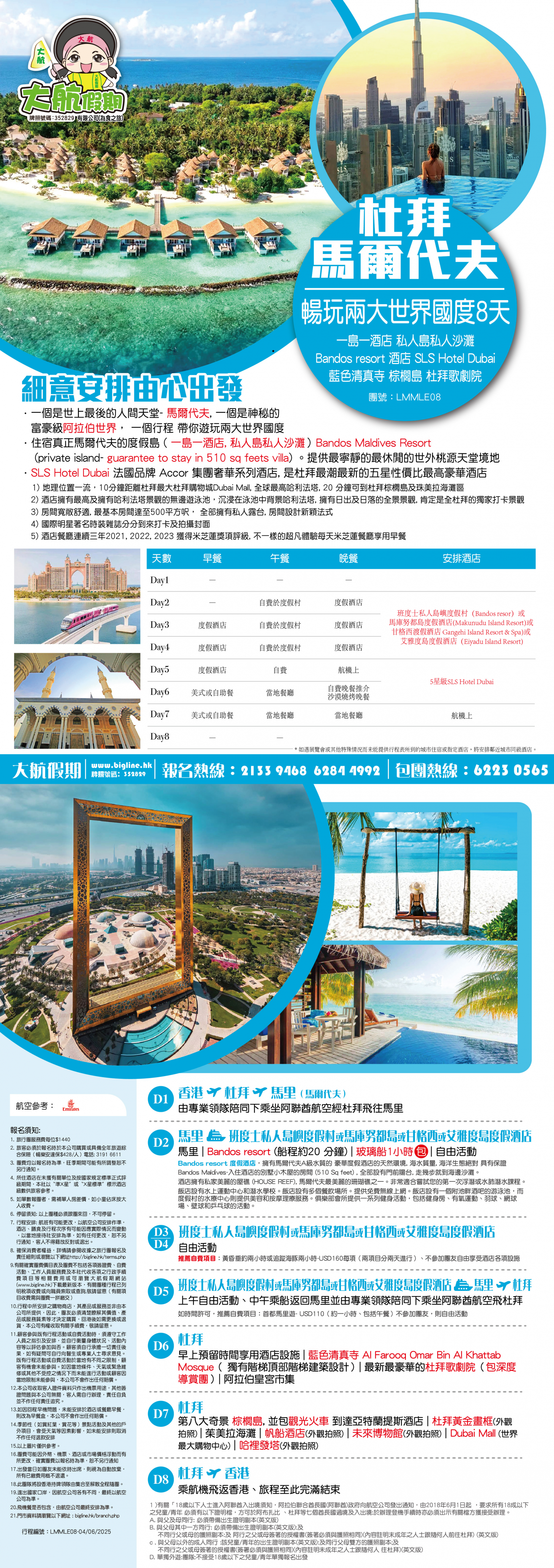*團員繳付退票費後 (如適用): 1) 已繳款項可保留半年; 或 2) 選擇轉團後, 餘款則保留半年; 或 3) 可繳付『迫不得已理由』之手續費後, 取回已付餘款。 *個別機票+酒店套票產品如因『迫不得已理由』取消外遊行程, 處理旅客退款時亦按以上訂列收取每位退票費及手續費, 並以行程表 (套票單張) 所列為準。 責任細則: 1. 本公司保留合併團隊出發的權利。 2. 行程書或單張內所列費用根據當時機票價格及國際貨幣兌換率而訂立。外幣浮動等情況之下, 本公司保留在出發前調整各項費用的權利及徵收額外費用。 3. 所有列出的交通服務資料只供參考, 如有更改概不負責, 一切須以出票時為準。 4. 除本公司直接提供之服務外, 本公司及其職員或附屬公司或與本公司有經營關係之公司代理人身份在香港或外地安排其他獨立機構所提供之交通工具 (如飛機、輪船、火車、或遊覽巴士等) 、住宿、膳食或娛樂觀光項目等 (“委託機構”), 團員如遇交通延誤、行李遺失、意外傷亡或財物損失等, 該依照當地法律向擁有、管理或操作之委託機構直接交涉或追討賠償, 通常該等機構均各訂位不同條例, 以對客人負責。在此情況下, 本公司概不對該等損失或傷亡負責。 5. 除因由本公司之員工或其他直接管理或操作之機構之疏忽而引致團員之個人傷亡外, 本公司對團員在任何意外中之個人傷亡、經濟、娛樂或精神損失概不負責。 6. 除經本公司同意及安排, 如團員自行更改由其他人士代為參團, 本公司或其委託機構之職員有權取消其隨團之資格, 而無須發還任何團費, 而該人士在隨團期間之保險、責任賠償、行為後果等均由該人仕自行承擔。 7. 如因天氣、罷工、戰爭、怠工或安全情況影響而引致有關交通工具暫停服務, 停航或其他事故, 而必須將行程更改或取消部份行程, 本公司則將團員所繳交之費用扣除因以上事故而引致之損失後, 退回差額給團員。 8. 有關住宿、膳食、遊覽節目等問題, 均依據行程表安排, 行程先後次序有可能需要更改, 一切以當地安排為準。若遇特殊情況, 如簽證受阻, 當地酒店突告客滿或航機改變飛行時間或地點, 以及非本公司或其委託機構所能控制之因素, 令旅行團節目有增減, 或臨時更改交通工具、班機時間、機種及更換酒店等等, 本公司或其委託機構得依當時情況全權盡力處理, 團員不得藉故反對或退出, 因故取消之節目, 將不獲退還款項, 任何因延期而引致之額外支出, 本公司或其委託機構概不負責。 9. 所有酒店及住宿根據行程安排, 本公司視乎當時情形作出更改, 但不限於遇展覽會或特殊情況下, 將住宿鄰近城市之同等級酒店及住宿代替。本公司如因『迫不得已理由(外遊)』(即指戰爭、政治動盪、恐怖襲擊、天災、疫症、惡劣天氣、交通工具發生技術問題、載運機構臨時更改班次或取消服務、罷工、工業行動、旅遊目的地政府或世界衛生組織發出旅遊警示(警告)、香港特別行政區政府發出紅色或黑色外遊警示、不可抗力事件,以及業界不能控制的其他不利離開香港或在香港境外旅遊的情況)於外遊旅行團出發後更改任何項目而引致成本增加,可向顧客徵收額外費用。 10. 【已成團】代表該團號之指定出發日期預訂機位或已有足夠人數報名參加。但出發與否還受其他因素影響, 本公司保留最終決定權。 11. 任何團員在參與各項活動時, 如經常不遵守服飾人員之指引或安排, 在行動或言語上侮辱或滋擾其他團員或工作人員, 本公司或其委託機構職員有權視具體情況而取消其隨團資格而母須發任何團費, 而受該旅客監護之18歲以下同行團員亦須一併離開, 有關旅客離團後一切活動, 概與本公司或其委託機構無關。 12. 團員如欲於旅程完畢後延期返港, 須於出發前十四天提出, 以便本公司代為預定返港機位, 延期返港之機位, 未能即時作實, 團員不得藉此理由要求退出, 旅程完畢後延期逗留之費用, 概由團員自負。 13. 延期返港之團友, 必須在離境前七十二小時向航空公司確實回程機位, 任何機位如有變更, 概與本公司無關。 14. 團員如在旅途中自行離團或放棄行程, 離團後之責任自負, 一切後果與本公司或其委託機構無關。 15. 參團者須切實遵守各國及各地法例, 包括但不限於防疫防控條例, 並嚴禁攜帶違例物品出入境, 並照實申報攜帶之物品及現金。 16. 任何種類的簽證審批權及出入境批准權一律由該國或地區之領事館及/或出入境部門全權決定, 出入境如有問題, 責任旅客自負, 本公司或其委託機構母須負任何責任。如簽證已代辦, 簽證費恕不退還。 17. 即使團員持有效之入境簽證及旅遊證件, 而於入境時被當值之移民局海關人員拒絕入境, 本公司或其委託機構亦無須負任何責任。所需額外安排之食宿、交通費用、全部由其本人負責, 其餘下的行程亦將不會獲得任何補償, 亦不得要求退款或改團。 18. 中國內地相關法規規定, 即日起旅客入住中國內地境內酒店時, 公安機關會透過酒店前台向旅客一併採集人像信息資訊。 19. 如出現一些非本公司能力範圍可控制之問題 (如花卉、紅葉提早凋謝或景觀、自然現象、景點活動或戶外項目) 會受天氣等因素影響, 如未能安排則取消不作任何退款安排。 20. 旅客如在旅程中確診 COVID-19或其他傳染病,無論受到當地政府隔離或其他檢疫要求影響與否,為確保其他旅客之安全,確診旅