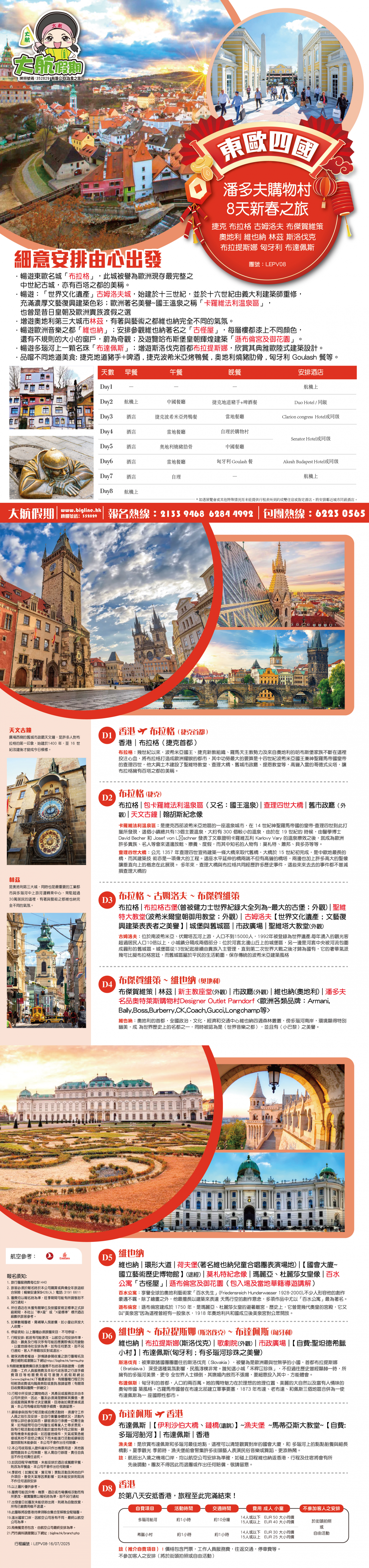 *團員繳付退票費後 (如適用): 1) 已繳款項可保留半年; 或 2) 選擇轉團後, 餘款則保留半年; 或 3) 可繳付『迫不得已理由』之手續費後, 取回已付餘款。 *個別機票+酒店套票產品如因『迫不得已理由』取消外遊行程, 處理旅客退款時亦按以上訂列收取每位退票費及手續費, 並以行程表 (套票單張) 所列為準。 責任細則: 1. 本公司保留合併團隊出發的權利。 2. 行程書或單張內所列費用根據當時機票價格及國際貨幣兌換率而訂立。外幣浮動等情況之下, 本公司保留在出發前調整各項費用的權利及徵收額外費用。 3. 所有列出的交通服務資料只供參考, 如有更改概不負責, 一切須以出票時為準。 4. 除本公司直接提供之服務外, 本公司及其職員或附屬公司或與本公司有經營關係之公司代理人身份在香港或外地安排其他獨立機構所提供之交通工具 (如飛機、輪船、火車、或遊覽巴士等) 、住宿、膳食或娛樂觀光項目等 (“委託機構”), 團員如遇交通延誤、行李遺失、意外傷亡或財物損失等, 該依照當地法律向擁有、管理或操作之委託機構直接交涉或追討賠償, 通常該等機構均各訂位不同條例, 以對客人負責。在此情況下, 本公司概不對該等損失或傷亡負責。 5. 除因由本公司之員工或其他直接管理或操作之機構之疏忽而引致團員之個人傷亡外, 本公司對團員在任何意外中之個人傷亡、經濟、娛樂或精神損失概不負責。 6. 除經本公司同意及安排, 如團員自行更改由其他人士代為參團, 本公司或其委託機構之職員有權取消其隨團之資格, 而無須發還任何團費, 而該人士在隨團期間之保險、責任賠償、行為後果等均由該人仕自行承擔。 7. 如因天氣、罷工、戰爭、怠工或安全情況影響而引致有關交通工具暫停服務, 停航或其他事故, 而必須將行程更改或取消部份行程, 本公司則將團員所繳交之費用扣除因以上事故而引致之損失後, 退回差額給團員。 8. 有關住宿、膳食、遊覽節目等問題, 均依據行程表安排, 行程先後次序有可能需要更改, 一切以當地安排為準。若遇特殊情況, 如簽證受阻, 當地酒店突告客滿或航機改變飛行時間或地點, 以及非本公司或其委託機構所能控制之因素, 令旅行團節目有增減, 或臨時更改交通工具、班機時間、機種及更換酒店等等, 本公司或其委託機構得依當時情況全權盡力處理, 團員不得藉故反對或退出, 因故取消之節目, 將不獲退還款項, 任何因延期而引致之額外支出, 本公司或其委託機構概不負責。 9. 所有酒店及住宿根據行程安排, 本公司視乎當時情形作出更改, 但不限於遇展覽會或特殊情況下, 將住宿鄰近城市之同等級酒店及住宿代替。本公司如因『迫不得已理由(外遊)』(即指戰爭、政治動盪、恐怖襲擊、天災、疫症、惡劣天氣、交通工具發生技術問題、載運機構臨時更改班次或取消服務、罷工、工業行動、旅遊目的地政府或世界衛生組織發出旅遊警示(警告)、香港特別行政區政府發出紅色或黑色外遊警示、不可抗力事件,以及業界不能控制的其他不利離開香港或在香港境外旅遊的情況)於外遊旅行團出發後更改任何項目而引致成本增加,可向顧客徵收額外費用。 10. 【已成團】代表該團號之指定出發日期預訂機位或已有足夠人數報名參加。但出發與否還受其他因素影響, 本公司保留最終決定權。 11. 任何團員在參與各項活動時, 如經常不遵守服飾人員之指引或安排, 在行動或言語上侮辱或滋擾其他團員或工作人員, 本公司或其委託機構職員有權視具體情況而取消其隨團資格而母須發任何團費, 而受該旅客監護之18歲以下同行團員亦須一併離開, 有關旅客離團後一切活動, 概與本公司或其委託機構無關。 12. 團員如欲於旅程完畢後延期返港, 須於出發前十四天提出, 以便本公司代為預定返港機位, 延期返港之機位, 未能即時作實, 團員不得藉此理由要求退出, 旅程完畢後延期逗留之費用, 概由團員自負。 13. 延期返港之團友, 必須在離境前七十二小時向航空公司確實回程機位, 任何機位如有變更, 概與本公司無關。 14. 團員如在旅途中自行離團或放棄行程, 離團後之責任自負, 一切後果與本公司或其委託機構無關。 15. 參團者須切實遵守各國及各地法例, 包括但不限於防疫防控條例, 並嚴禁攜帶違例物品出入境, 並照實申報攜帶之物品及現金。 16. 任何種類的簽證審批權及出入境批准權一律由該國或地區之領事館及/或出入境部門全權決定, 出入境如有問題, 責任旅客自負, 本公司或其委託機構母須負任何責任。如簽證已代辦, 簽證費恕不退還。 17. 即使團員持有效之入境簽證及旅遊證件, 而於入境時被當值之移民局海關人員拒絕入境, 本公司或其委託機構亦無須負任何責任。所需額外安排之食宿、交通費用、全部由其本人負責, 其餘下的行程亦將不會獲得任何補償, 亦不得要求退款或改團。 18. 中國內地相關法規規定, 即日起旅客入住中國內地境內酒店時, 公安機關會透過酒店前台向旅客一併採集人像信息資訊。 19. 如出現一些非本公司能力範圍可控制之問題 (如花卉、紅葉提早凋謝或景觀、自然現象、景點活動或戶外項目) 會受天氣等因素影響, 如未能安排則取消不作任何退款安排。 20. 旅客如在旅程中確診 COVID-19或其他傳染病,無論受到當地政府隔離或其他檢疫要求影響與否,為確保其他旅客之安全,確診旅