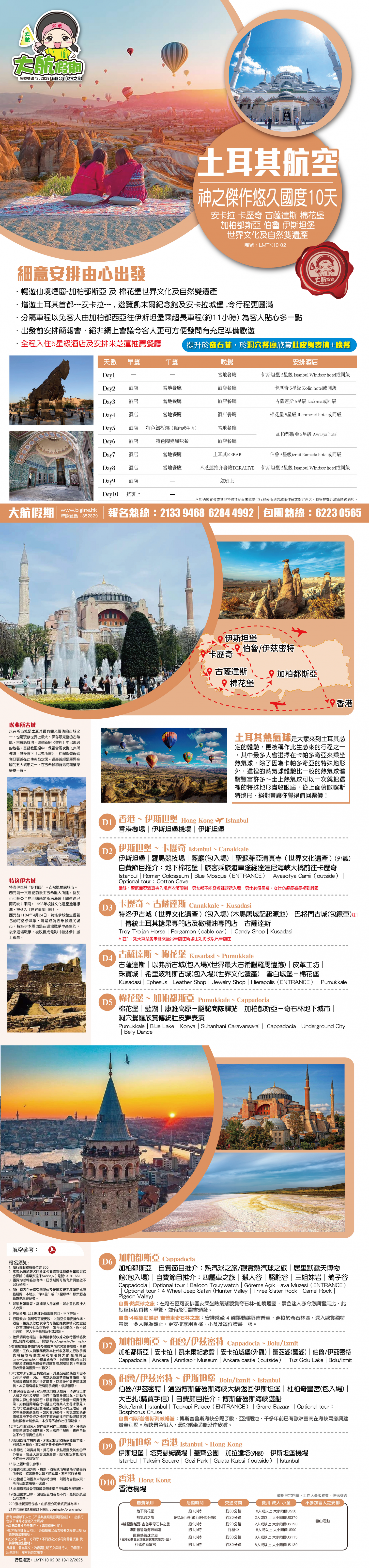 *團員繳付退票費後 (如適用): 1) 已繳款項可保留半年; 或 2) 選擇轉團後, 餘款則保留半年; 或 3) 可繳付『迫不得已理由』之手續費後, 取回已付餘款。 *個別機票+酒店套票產品如因『迫不得已理由』取消外遊行程, 處理旅客退款時亦按以上訂列收取每位退票費及手續費, 並以行程表 (套票單張) 所列為準。 責任細則: 1. 本公司保留合併團隊出發的權利。 2. 行程書或單張內所列費用根據當時機票價格及國際貨幣兌換率而訂立。外幣浮動等情況之下, 本公司保留在出發前調整各項費用的權利及徵收額外費用。 3. 所有列出的交通服務資料只供參考, 如有更改概不負責, 一切須以出票時為準。 4. 除本公司直接提供之服務外, 本公司及其職員或附屬公司或與本公司有經營關係之公司代理人身份在香港或外地安排其他獨立機構所提供之交通工具 (如飛機、輪船、火車、或遊覽巴士等) 、住宿、膳食或娛樂觀光項目等 (“委託機構”), 團員如遇交通延誤、行李遺失、意外傷亡或財物損失等, 該依照當地法律向擁有、管理或操作之委託機構直接交涉或追討賠償, 通常該等機構均各訂位不同條例, 以對客人負責。在此情況下, 本公司概不對該等損失或傷亡負責。 5. 除因由本公司之員工或其他直接管理或操作之機構之疏忽而引致團員之個人傷亡外, 本公司對團員在任何意外中之個人傷亡、經濟、娛樂或精神損失概不負責。 6. 除經本公司同意及安排, 如團員自行更改由其他人士代為參團, 本公司或其委託機構之職員有權取消其隨團之資格, 而無須發還任何團費, 而該人士在隨團期間之保險、責任賠償、行為後果等均由該人仕自行承擔。 7. 如因天氣、罷工、戰爭、怠工或安全情況影響而引致有關交通工具暫停服務, 停航或其他事故, 而必須將行程更改或取消部份行程, 本公司則將團員所繳交之費用扣除因以上事故而引致之損失後, 退回差額給團員。 8. 有關住宿、膳食、遊覽節目等問題, 均依據行程表安排, 行程先後次序有可能需要更改, 一切以當地安排為準。若遇特殊情況, 如簽證受阻, 當地酒店突告客滿或航機改變飛行時間或地點, 以及非本公司或其委託機構所能控制之因素, 令旅行團節目有增減, 或臨時更改交通工具、班機時間、機種及更換酒店等等, 本公司或其委託機構得依當時情況全權盡力處理, 團員不得藉故反對或退出, 因故取消之節目, 將不獲退還款項, 任何因延期而引致之額外支出, 本公司或其委託機構概不負責。 9. 所有酒店及住宿根據行程安排, 本公司視乎當時情形作出更改, 但不限於遇展覽會或特殊情況下, 將住宿鄰近城市之同等級酒店及住宿代替。本公司如因『迫不得已理由(外遊)』(即指戰爭、政治動盪、恐怖襲擊、天災、疫症、惡劣天氣、交通工具發生技術問題、載運機構臨時更改班次或取消服務、罷工、工業行動、旅遊目的地政府或世界衛生組織發出旅遊警示(警告)、香港特別行政區政府發出紅色或黑色外遊警示、不可抗力事件,以及業界不能控制的其他不利離開香港或在香港境外旅遊的情況)於外遊旅行團出發後更改任何項目而引致成本增加,可向顧客徵收額外費用。 10. 【已成團】代表該團號之指定出發日期預訂機位或已有足夠人數報名參加。但出發與否還受其他因素影響, 本公司保留最終決定權。 11. 任何團員在參與各項活動時, 如經常不遵守服飾人員之指引或安排, 在行動或言語上侮辱或滋擾其他團員或工作人員, 本公司或其委託機構職員有權視具體情況而取消其隨團資格而母須發任何團費, 而受該旅客監護之18歲以下同行團員亦須一併離開, 有關旅客離團後一切活動, 概與本公司或其委託機構無關。 12. 團員如欲於旅程完畢後延期返港, 須於出發前十四天提出, 以便本公司代為預定返港機位, 延期返港之機位, 未能即時作實, 團員不得藉此理由要求退出, 旅程完畢後延期逗留之費用, 概由團員自負。 13. 延期返港之團友, 必須在離境前七十二小時向航空公司確實回程機位, 任何機位如有變更, 概與本公司無關。 14. 團員如在旅途中自行離團或放棄行程, 離團後之責任自負, 一切後果與本公司或其委託機構無關。 15. 參團者須切實遵守各國及各地法例, 包括但不限於防疫防控條例, 並嚴禁攜帶違例物品出入境, 並照實申報攜帶之物品及現金。 16. 任何種類的簽證審批權及出入境批准權一律由該國或地區之領事館及/或出入境部門全權決定, 出入境如有問題, 責任旅客自負, 本公司或其委託機構母須負任何責任。如簽證已代辦, 簽證費恕不退還。 17. 即使團員持有效之入境簽證及旅遊證件, 而於入境時被當值之移民局海關人員拒絕入境, 本公司或其委託機構亦無須負任何責任。所需額外安排之食宿、交通費用、全部由其本人負責, 其餘下的行程亦將不會獲得任何補償, 亦不得要求退款或改團。 18. 中國內地相關法規規定, 即日起旅客入住中國內地境內酒店時, 公安機關會透過酒店前台向旅客一併採集人像信息資訊。 19. 如出現一些非本公司能力範圍可控制之問題 (如花卉、紅葉提早凋謝或景觀、自然現象、景點活動或戶外項目) 會受天氣等因素影響, 如未能安排則取消不作任何退款安排。 20. 旅客如在旅程中確診 COVID-19或其他傳染病,無論受到當地政府隔離或其他檢疫要求影響與否,為確保其他旅客之安全,確診旅