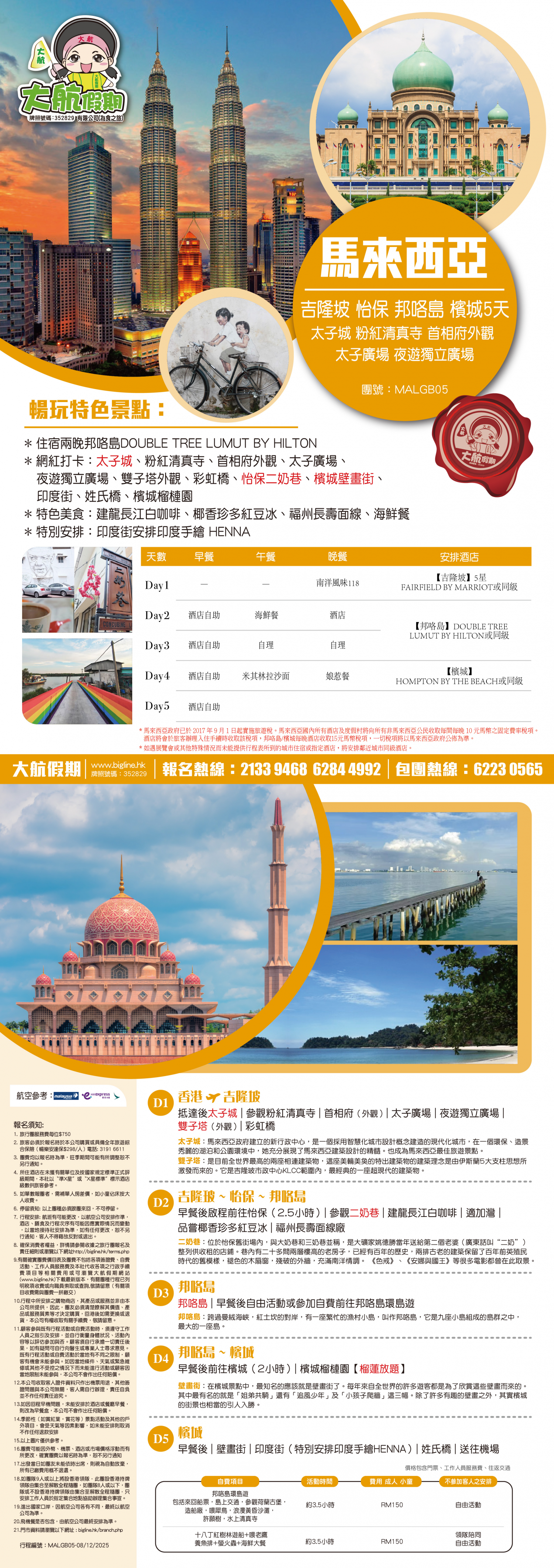 *團員繳付退票費後 (如適用): 1) 已繳款項可保留半年; 或 2) 選擇轉團後, 餘款則保留半年; 或 3) 可繳付『迫不得已理由』之手續費後, 取回已付餘款。 *個別機票+酒店套票產品如因『迫不得已理由』取消外遊行程, 處理旅客退款時亦按以上訂列收取每位退票費及手續費, 並以行程表 (套票單張) 所列為準。 責任細則: 1. 本公司保留合併團隊出發的權利。 2. 行程書或單張內所列費用根據當時機票價格及國際貨幣兌換率而訂立。外幣浮動等情況之下, 本公司保留在出發前調整各項費用的權利及徵收額外費用。 3. 所有列出的交通服務資料只供參考, 如有更改概不負責, 一切須以出票時為準。 4. 除本公司直接提供之服務外, 本公司及其職員或附屬公司或與本公司有經營關係之公司代理人身份在香港或外地安排其他獨立機構所提供之交通工具 (如飛機、輪船、火車、或遊覽巴士等) 、住宿、膳食或娛樂觀光項目等 (“委託機構”), 團員如遇交通延誤、行李遺失、意外傷亡或財物損失等, 該依照當地法律向擁有、管理或操作之委託機構直接交涉或追討賠償, 通常該等機構均各訂位不同條例, 以對客人負責。在此情況下, 本公司概不對該等損失或傷亡負責。 5. 除因由本公司之員工或其他直接管理或操作之機構之疏忽而引致團員之個人傷亡外, 本公司對團員在任何意外中之個人傷亡、經濟、娛樂或精神損失概不負責。 6. 除經本公司同意及安排, 如團員自行更改由其他人士代為參團, 本公司或其委託機構之職員有權取消其隨團之資格, 而無須發還任何團費, 而該人士在隨團期間之保險、責任賠償、行為後果等均由該人仕自行承擔。 7. 如因天氣、罷工、戰爭、怠工或安全情況影響而引致有關交通工具暫停服務, 停航或其他事故, 而必須將行程更改或取消部份行程, 本公司則將團員所繳交之費用扣除因以上事故而引致之損失後, 退回差額給團員。 8. 有關住宿、膳食、遊覽節目等問題, 均依據行程表安排, 行程先後次序有可能需要更改, 一切以當地安排為準。若遇特殊情況, 如簽證受阻, 當地酒店突告客滿或航機改變飛行時間或地點, 以及非本公司或其委託機構所能控制之因素, 令旅行團節目有增減, 或臨時更改交通工具、班機時間、機種及更換酒店等等, 本公司或其委託機構得依當時情況全權盡力處理, 團員不得藉故反對或退出, 因故取消之節目, 將不獲退還款項, 任何因延期而引致之額外支出, 本公司或其委託機構概不負責。 9. 所有酒店及住宿根據行程安排, 本公司視乎當時情形作出更改, 但不限於遇展覽會或特殊情況下, 將住宿鄰近城市之同等級酒店及住宿代替。本公司如因『迫不得已理由(外遊)』(即指戰爭、政治動盪、恐怖襲擊、天災、疫症、惡劣天氣、交通工具發生技術問題、載運機構臨時更改班次或取消服務、罷工、工業行動、旅遊目的地政府或世界衛生組織發出旅遊警示(警告)、香港特別行政區政府發出紅色或黑色外遊警示、不可抗力事件,以及業界不能控制的其他不利離開香港或在香港境外旅遊的情況)於外遊旅行團出發後更改任何項目而引致成本增加,可向顧客徵收額外費用。 10. 【已成團】代表該團號之指定出發日期預訂機位或已有足夠人數報名參加。但出發與否還受其他因素影響, 本公司保留最終決定權。 11. 任何團員在參與各項活動時, 如經常不遵守服飾人員之指引或安排, 在行動或言語上侮辱或滋擾其他團員或工作人員, 本公司或其委託機構職員有權視具體情況而取消其隨團資格而母須發任何團費, 而受該旅客監護之18歲以下同行團員亦須一併離開, 有關旅客離團後一切活動, 概與本公司或其委託機構無關。 12. 團員如欲於旅程完畢後延期返港, 須於出發前十四天提出, 以便本公司代為預定返港機位, 延期返港之機位, 未能即時作實, 團員不得藉此理由要求退出, 旅程完畢後延期逗留之費用, 概由團員自負。 13. 延期返港之團友, 必須在離境前七十二小時向航空公司確實回程機位, 任何機位如有變更, 概與本公司無關。 14. 團員如在旅途中自行離團或放棄行程, 離團後之責任自負, 一切後果與本公司或其委託機構無關。 15. 參團者須切實遵守各國及各地法例, 包括但不限於防疫防控條例, 並嚴禁攜帶違例物品出入境, 並照實申報攜帶之物品及現金。 16. 任何種類的簽證審批權及出入境批准權一律由該國或地區之領事館及/或出入境部門全權決定, 出入境如有問題, 責任旅客自負, 本公司或其委託機構母須負任何責任。如簽證已代辦, 簽證費恕不退還。 17. 即使團員持有效之入境簽證及旅遊證件, 而於入境時被當值之移民局海關人員拒絕入境, 本公司或其委託機構亦無須負任何責任。所需額外安排之食宿、交通費用、全部由其本人負責, 其餘下的行程亦將不會獲得任何補償, 亦不得要求退款或改團。 18. 中國內地相關法規規定, 即日起旅客入住中國內地境內酒店時, 公安機關會透過酒店前台向旅客一併採集人像信息資訊。 19. 如出現一些非本公司能力範圍可控制之問題 (如花卉、紅葉提早凋謝或景觀、自然現象、景點活動或戶外項目) 會受天氣等因素影響, 如未能安排則取消不作任何退款安排。 20. 旅客如在旅程中確診 COVID-19或其他傳染病,無論受到當地政府隔離或其他檢疫要求影響與否,為確保其他旅客之安全,確診旅
