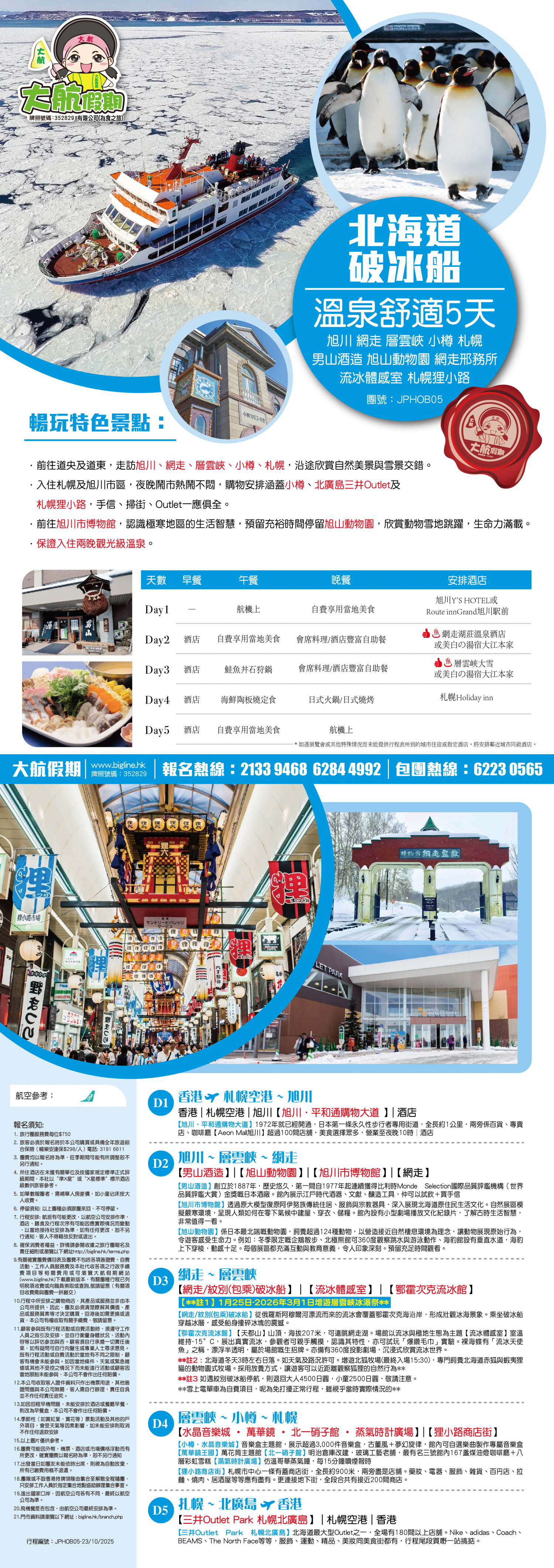 *團員繳付退票費後 (如適用): 1) 已繳款項可保留半年; 或 2) 選擇轉團後, 餘款則保留半年; 或 3) 可繳付『迫不得已理由』之手續費後, 取回已付餘款。 *個別機票+酒店套票產品如因『迫不得已理由』取消外遊行程, 處理旅客退款時亦按以上訂列收取每位退票費及手續費, 並以行程表 (套票單張) 所列為準。 責任細則: 1. 本公司保留合併團隊出發的權利。 2. 行程書或單張內所列費用根據當時機票價格及國際貨幣兌換率而訂立。外幣浮動等情況之下, 本公司保留在出發前調整各項費用的權利及徵收額外費用。 3. 所有列出的交通服務資料只供參考, 如有更改概不負責, 一切須以出票時為準。 4. 除本公司直接提供之服務外, 本公司及其職員或附屬公司或與本公司有經營關係之公司代理人身份在香港或外地安排其他獨立機構所提供之交通工具 (如飛機、輪船、火車、或遊覽巴士等) 、住宿、膳食或娛樂觀光項目等 (“委託機構”), 團員如遇交通延誤、行李遺失、意外傷亡或財物損失等, 該依照當地法律向擁有、管理或操作之委託機構直接交涉或追討賠償, 通常該等機構均各訂位不同條例, 以對客人負責。在此情況下, 本公司概不對該等損失或傷亡負責。 5. 除因由本公司之員工或其他直接管理或操作之機構之疏忽而引致團員之個人傷亡外, 本公司對團員在任何意外中之個人傷亡、經濟、娛樂或精神損失概不負責。 6. 除經本公司同意及安排, 如團員自行更改由其他人士代為參團, 本公司或其委託機構之職員有權取消其隨團之資格, 而無須發還任何團費, 而該人士在隨團期間之保險、責任賠償、行為後果等均由該人仕自行承擔。 7. 如因天氣、罷工、戰爭、怠工或安全情況影響而引致有關交通工具暫停服務, 停航或其他事故, 而必須將行程更改或取消部份行程, 本公司則將團員所繳交之費用扣除因以上事故而引致之損失後, 退回差額給團員。 8. 有關住宿、膳食、遊覽節目等問題, 均依據行程表安排, 行程先後次序有可能需要更改, 一切以當地安排為準。若遇特殊情況, 如簽證受阻, 當地酒店突告客滿或航機改變飛行時間或地點, 以及非本公司或其委託機構所能控制之因素, 令旅行團節目有增減, 或臨時更改交通工具、班機時間、機種及更換酒店等等, 本公司或其委託機構得依當時情況全權盡力處理, 團員不得藉故反對或退出, 因故取消之節目, 將不獲退還款項, 任何因延期而引致之額外支出, 本公司或其委託機構概不負責。 9. 所有酒店及住宿根據行程安排, 本公司視乎當時情形作出更改, 但不限於遇展覽會或特殊情況下, 將住宿鄰近城市之同等級酒店及住宿代替。本公司如因『迫不得已理由(外遊)』(即指戰爭、政治動盪、恐怖襲擊、天災、疫症、惡劣天氣、交通工具發生技術問題、載運機構臨時更改班次或取消服務、罷工、工業行動、旅遊目的地政府或世界衛生組織發出旅遊警示(警告)、香港特別行政區政府發出紅色或黑色外遊警示、不可抗力事件,以及業界不能控制的其他不利離開香港或在香港境外旅遊的情況)於外遊旅行團出發後更改任何項目而引致成本增加,可向顧客徵收額外費用。 10. 【已成團】代表該團號之指定出發日期預訂機位或已有足夠人數報名參加。但出發與否還受其他因素影響, 本公司保留最終決定權。 11. 任何團員在參與各項活動時, 如經常不遵守服飾人員之指引或安排, 在行動或言語上侮辱或滋擾其他團員或工作人員, 本公司或其委託機構職員有權視具體情況而取消其隨團資格而母須發任何團費, 而受該旅客監護之18歲以下同行團員亦須一併離開, 有關旅客離團後一切活動, 概與本公司或其委託機構無關。 12. 團員如欲於旅程完畢後延期返港, 須於出發前十四天提出, 以便本公司代為預定返港機位, 延期返港之機位, 未能即時作實, 團員不得藉此理由要求退出, 旅程完畢後延期逗留之費用, 概由團員自負。 13. 延期返港之團友, 必須在離境前七十二小時向航空公司確實回程機位, 任何機位如有變更, 概與本公司無關。 14. 團員如在旅途中自行離團或放棄行程, 離團後之責任自負, 一切後果與本公司或其委託機構無關。 15. 參團者須切實遵守各國及各地法例, 包括但不限於防疫防控條例, 並嚴禁攜帶違例物品出入境, 並照實申報攜帶之物品及現金。 16. 任何種類的簽證審批權及出入境批准權一律由該國或地區之領事館及/或出入境部門全權決定, 出入境如有問題, 責任旅客自負, 本公司或其委託機構母須負任何責任。如簽證已代辦, 簽證費恕不退還。 17. 即使團員持有效之入境簽證及旅遊證件, 而於入境時被當值之移民局海關人員拒絕入境, 本公司或其委託機構亦無須負任何責任。所需額外安排之食宿、交通費用、全部由其本人負責, 其餘下的行程亦將不會獲得任何補償, 亦不得要求退款或改團。 18. 中國內地相關法規規定, 即日起旅客入住中國內地境內酒店時, 公安機關會透過酒店前台向旅客一併採集人像信息資訊。 19. 如出現一些非本公司能力範圍可控制之問題 (如花卉、紅葉提早凋謝或景觀、自然現象、景點活動或戶外項目) 會受天氣等因素影響, 如未能安排則取消不作任何退款安排。 20. 旅客如在旅程中確診 COVID-19或其他傳染病,無論受到當地政府隔離或其他檢疫要求影響與否,為確保其他旅客之安全,確診旅
