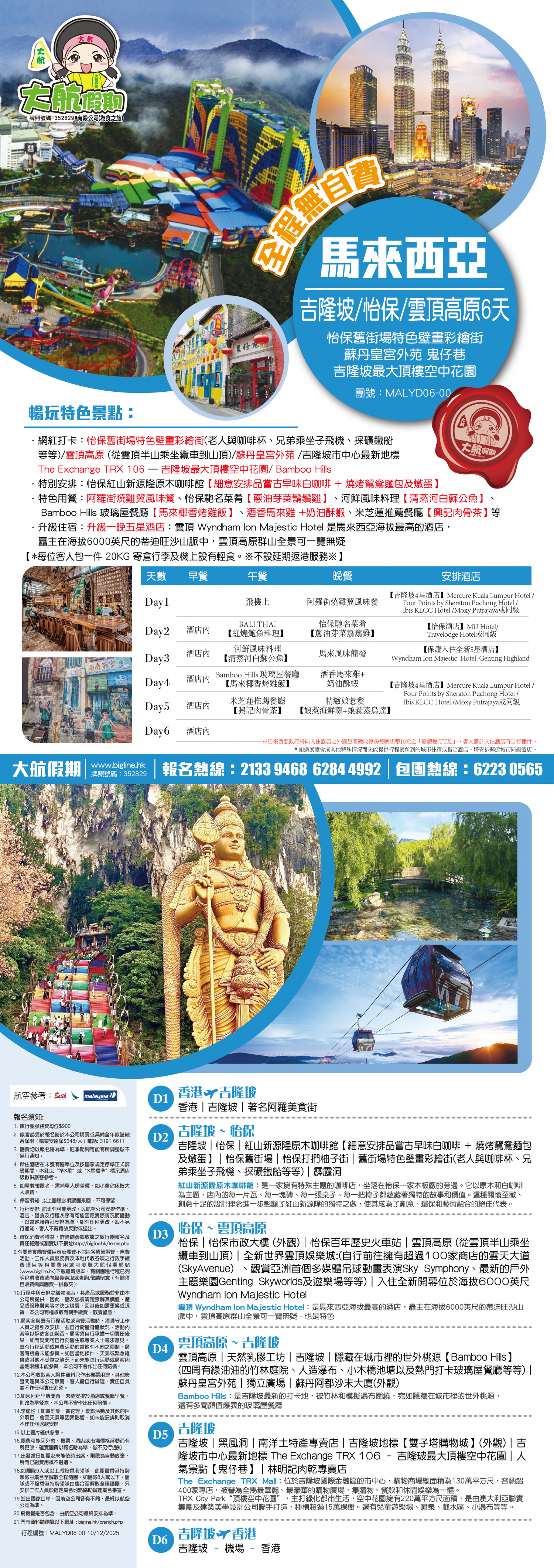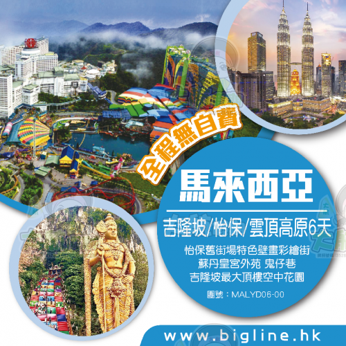怡保 – 怡保市政大樓 (外觀) - 怡保百年歷史火車站 - 雲頂高原 (從雲頂半山乘坐纜車到山頂) – 全新世界雲頂娛樂城 : (自行前往擁有超過100家商店的雲天大道(SkyAvenue) 、觀賞亞洲首個多媒體吊球動畫表演Sky Symphony、最新的戶外主題樂園 Genting Skyworlds及遊樂場等等) - 入住全新開幕位於海拔6000英尺Wyndham Ion Majestic Hotel