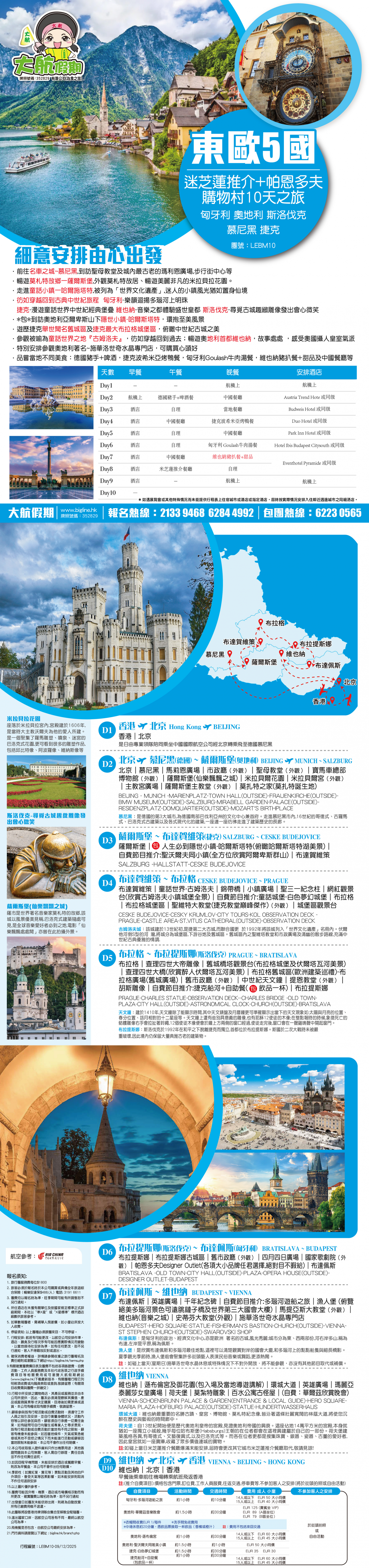布達佩斯|英雄廣場|千年紀念碑|自費節目推介:多瑙河游船之旅|漁人堡(俯絕美多瑙河景色可遠眺鏈子橋及世界第三大國會大樓)馬提亞斯大教堂(外觀)維也納(音樂之城) 史蒂芬大教堂(外觀) 施華洛世奇水晶專門店布達侃斯:是匆牙利的政治、經濟文化中心,亦是歐洲 著名的古城,風光秀麗:城市分為東、西兩部份