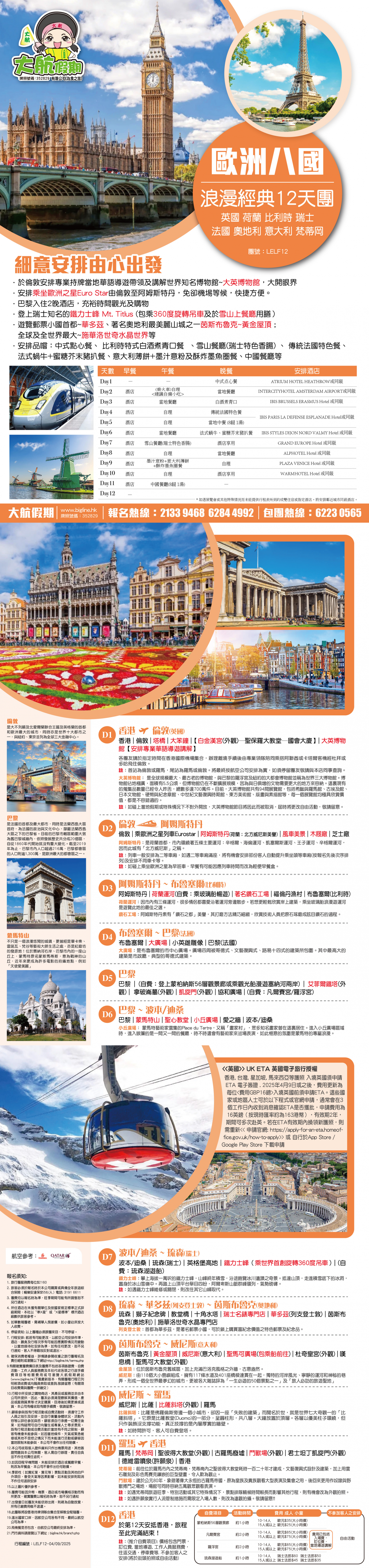 6. 團費及其他相關費用包括但不限於:稅項、機場保安費、旅行團服務費、郵輪服務費、旅遊保險的保費、有關簽證及其相關費用(包括但不限於簽證費及代辦簽證的服務費/手續費)須在出發前21天繳清, 長線則為30天前 (旺季期間須在出發前30天繳付, 長線則為 45天前), 個別線路亦將因應不同供應商之經營條件而作出調整,以該團的單張資料為準; 逾期未清繳費用者, 本公司得將訂位作廢, 所繳訂金例不發還, 亦不得將訂金轉予他人或轉用於其他日子出發及其他旅行團。 7. 付款方式以各訂購渠道之系統可接受為準。 8. 所有一切代收之款項,包括但不限於燃油附加費、香港及各地機場稅和機場建設稅等, 本公司只接受以現金或易辦事繳付所有代收費用。 - 信用卡/分期付款計劃或銀聯卡付款, 以銀行確認成功過賬, 方可作實。 - 請保留收據, 以作退款之憑據, 如以信用卡免息分期或銀聯卡付款, 則退款必須經由銀行辦理手續, 退回該信用卡/銀行戶口, 需時最少約三十五個工作天, 退款時間及一切有關條款均由信用卡公司決定。 9. 鑑於外幣浮動、因燃油附加費的浮動以致機票成本增加、或因事前未能預見的情況(包括但不限於交通票、酒店、保險等方面)導致成本上升, 本公司保留權利在顧客繳付全部團費及其他相關費用前向有關顧客徵收額外費用。價格如有更改, 將會另行通知。燃油附加費價格以航空公司最後公佈為準。一切費用必須於出發前全數繳付。受影響的顧客在無損其法律權利和責任的原則下,可選擇支付該額外費用以繼續參加該旅行團,或於該旅行團出發前選擇退出。如屬後者,本公司將於發出徵收額外費用通知後的七個工作日內(發出通知當日不計)或於顧客選擇退出該旅行團後的七個工作日內(顧客退出當日不計)(以較後發生者為準)退還或(如顧客以信用卡繳付款項)安排退還顧客所付的款項。 10. 減免折扣優惠, 必須於報名時申請及提供證明予本公司, 概不補發。 11. 當地參團之團費不設任何優惠。團員亦須自備國際機票、所有內陸機票及個別路線之部份交通安排。 12. 本公司收費上的年齡定義 : 0至23 個月為嬰兒; 2至11歲為小童 (根據不同線路釐定小童的年齡定義) ; 12歲或以上為成人。 13. 對未滿 18歲的顧客須符合下列報名要求: - 15 歲以下, 必須與父母及監護人同行 - 滿 15歲而未滿 18歲; 如非與父母或監護人同行, 則必須由父母及監護人同意並於報名表簽署作實及具備一份合適的旅遊綜合保險。 14. 各項交通服務供應商對乘載最高懷孕週數之孕婦或最低參加年齡之嬰兒各有所不同, 詳情請向本公司職員查詢。 15. 交通服務供應商可視乎顧客健康狀況, 要求醫療證明及或有效期內的新冠病毒陰性證明以示適合乘搭該交通, 並保留拒絕顧客登乘之權利。 16. 本公司保留接受報名與否之最終權利。 17. 所有團隊不包旅遊保險,本公司要求客人報名時須同時購買個人旅遊保險(廣東省旅行團除外),如客人自備個人全年旅遊保險則可豁免。廣東省旅行團如客人選擇不購買旅遊保險,閣下之人生及財物安全必須自理,責任概與旅行社無關。如客人非透過本公司購買個人旅遊保險而又要求本公司發出有關保險證明,則須收取港幣$100/人作為手續費。 費用包括: 1. 機票:來回經濟客位機票。(飛機線適用) 2. 酒店:根據行程表內所列之酒店或同級,以兩人共用一房為標準。單人房附加費則以一人佔一房為準。 3. 膳食:行程表內所列之團餐,交通服務供應商所提供之膳食則以其最終安排為準。 4. 鐵路 : 行程表所列之鐵路車票。 5. 交通:採用空氣調節遊覽車,開關冷暖氣需根據當地條例執行。 6. 觀光:各項遊覽節目均按照行程表內所列之遊覽節目及入場費用為根據。 7. 導遊 : 專業領隊/導遊隨團出發, 沿途安排及介紹。本公司於特殊情況下, 保留派領隊隨團出發之最終決定權, 團員不得籍故反對或退出。 8. 行李 : 每位限攜帶手提行李一件, 規格以交通服務供應商為準。寄艙行李數量及重量需視乎交通服務供應商而定, 如行李額外超重, 費用需由客人承擔。 9. 嬰兒收費只包括交通服務供應商出票費,不包括機位或座位、酒店、膳食及其他佔用座位之交通等安排。為免生疑問,本公司將不會為嬰兒額外提供團餐、酒店床位及任何交通公具(包括但不限於旅遊巴)的座位。如旅客要求提供嬰兒床,本公司將協助旅客向酒店要求安排,但酒店方面保留最終決定權。 費用不包括: 1. 旅遊證件及各國入境簽證費用。 2. 給予導遊/領隊/司機/工作人員之旅行團服務費。 3. 各地機場稅、額外附加費及指定稅項。 4. 行李超重費用。 5. 旅遊業監管印花成本。 6. 酒店、機場及各類交通工具之行李生服務費。 7. 自費項目或行程表以外之觀光節目。 8. 因交通阻延、罷工、颱風或其他突發情況而非本公司所能控制而引致之額外費用。 9. 綜合旅遊保險。為使各旅客獲得完善的旅遊保障,本公司建議必須自行購買綜合旅遊保險。 臨時取消及退款細則: 1. 本公司有權在旅行團出發前取消旅行團 (如參加人數不足 15人) 。在此等情況下, 本公司將按照下列規定處理:(取消3天或以下的旅行團)最少於出發前一日通知顧客;(取消4至9天的旅行團)最少於出發前七日通知顧客;(取消10天或以上的旅行團)最少於出發前14日通知顧客(通知顧客及出發當日均不計),以上不包括旺季及大假期的取