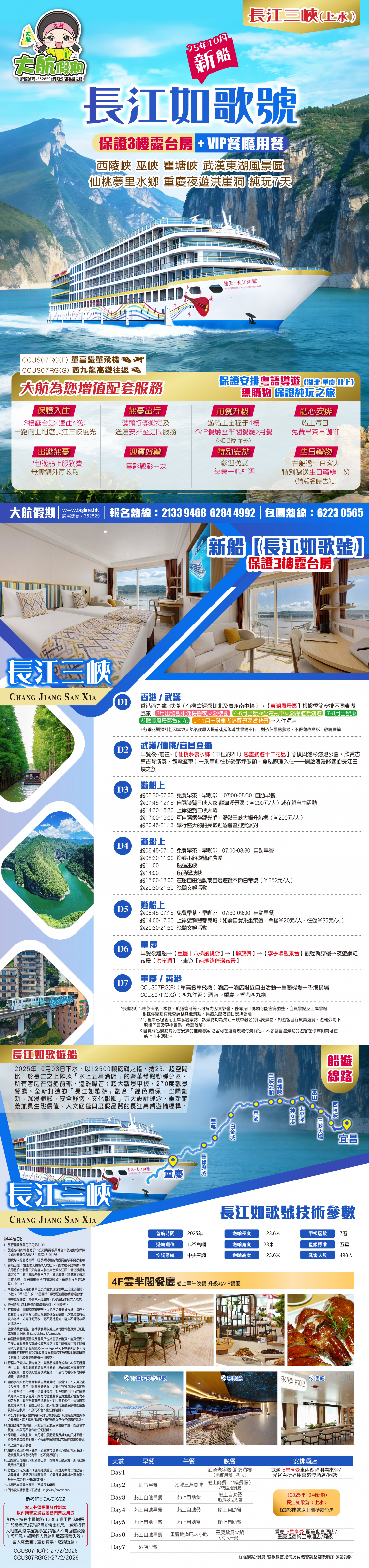特別說明:1.由於天氣、水位、航道管制等不可抗力因素影響,停靠港口碼頭可能會有調整,自費景點根據停靠點有機會調整其他景點,具體以船方當日安排為准;