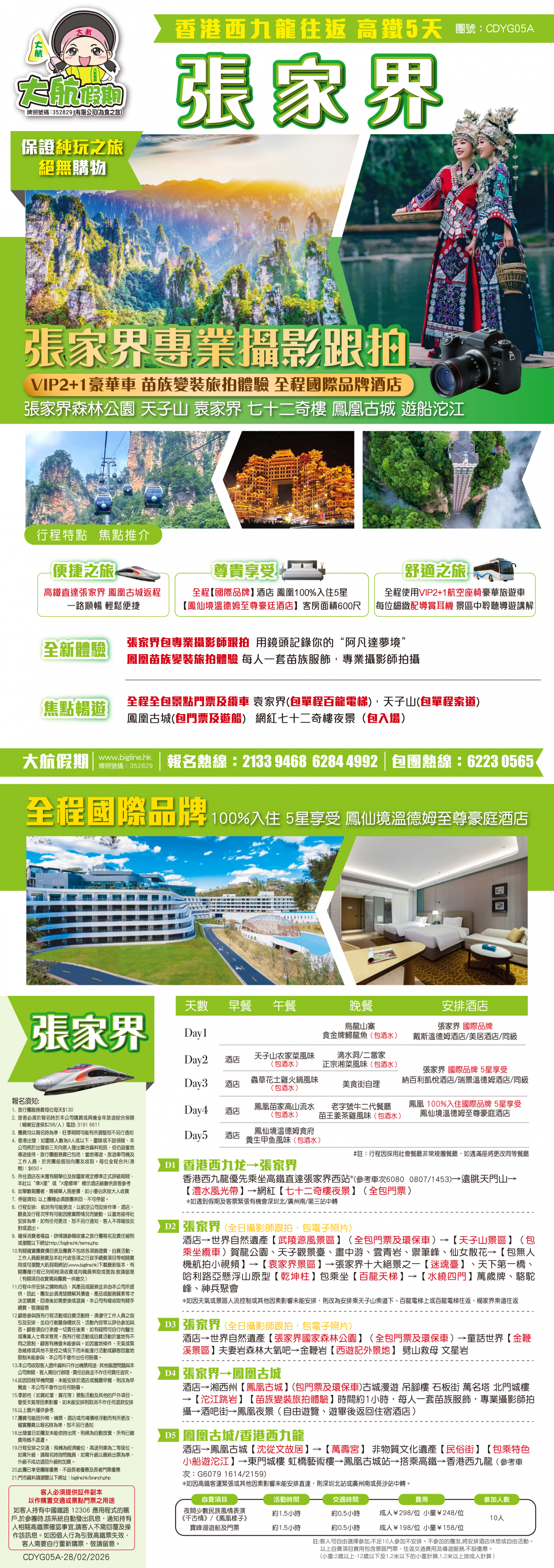 《西九直達張家界*鳳凰返》 #粵語導遊#2026推出「全港雙獨家」《“神仙民宿”山水澗·德夯雅苑 古城觀景位下午茶》張家界森林公園 鳳凰古城<VIP通道 苗族變裝旅拍>德夯苗寨 免稅纯玩5天