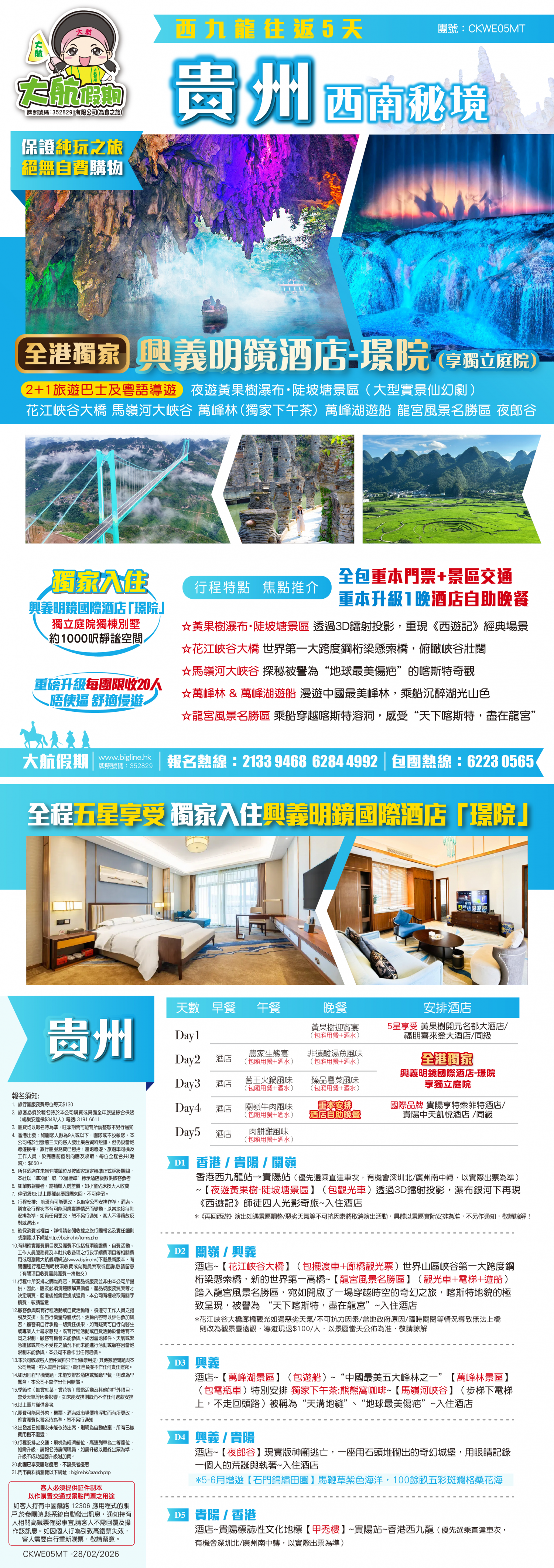 *團員繳付退票費後 (如適用): 1) 已繳款項可保留半年; 或 2) 選擇轉團後, 餘款則保留半年; 或 3) 可繳付『迫不得已理由』之手續費後, 取回已付餘款。 *個別機票+酒店套票產品如因『迫不得已理由』取消外遊行程, 處理旅客退款時亦按以上訂列收取每位退票費及手續費, 並以行程表 (套票單張) 所列為準。 責任細則: 1. 本公司保留合併團隊出發的權利。 2. 行程書或單張內所列費用根據當時機票價格及國際貨幣兌換率而訂立。外幣浮動等情況之下, 本公司保留在出發前調整各項費用的權利及徵收額外費用。 3. 所有列出的交通服務資料只供參考, 如有更改概不負責, 一切須以出票時為準。 4. 除本公司直接提供之服務外, 本公司及其職員或附屬公司或與本公司有經營關係之公司代理人身份在香港或外地安排其他獨立機構所提供之交通工具 (如飛機、輪船、火車、或遊覽巴士等) 、住宿、膳食或娛樂觀光項目等 (“委託機構”), 團員如遇交通延誤、行李遺失、意外傷亡或財物損失等, 該依照當地法律向擁有、管理或操作之委託機構直接交涉或追討賠償, 通常該等機構均各訂位不同條例, 以對客人負責。在此情況下, 本公司概不對該等損失或傷亡負責。 5. 除因由本公司之員工或其他直接管理或操作之機構之疏忽而引致團員之個人傷亡外, 本公司對團員在任何意外中之個人傷亡、經濟、娛樂或精神損失概不負責。 6. 除經本公司同意及安排, 如團員自行更改由其他人士代為參團, 本公司或其委託機構之職員有權取消其隨團之資格, 而無須發還任何團費, 而該人士在隨團期間之保險、責任賠償、行為後果等均由該人仕自行承擔。 7. 如因天氣、罷工、戰爭、怠工或安全情況影響而引致有關交通工具暫停服務, 停航或其他事故, 而必須將行程更改或取消部份行程, 本公司則將團員所繳交之費用扣除因以上事故而引致之損失後, 退回差額給團員。 8. 有關住宿、膳食、遊覽節目等問題, 均依據行程表安排, 行程先後次序有可能需要更改, 一切以當地安排為準。若遇特殊情況, 如簽證受阻, 當地酒店突告客滿或航機改變飛行時間或地點, 以及非本公司或其委託機構所能控制之因素, 令旅行團節目有增減, 或臨時更改交通工具、班機時間、機種及更換酒店等等, 本公司或其委託機構得依當時情況全權盡力處理, 團員不得藉故反對或退出, 因故取消之節目, 將不獲退還款項, 任何因延期而引致之額外支出, 本公司或其委託機構概不負責。 9. 所有酒店及住宿根據行程安排, 本公司視乎當時情形作出更改, 但不限於遇展覽會或特殊情況下, 將住宿鄰近城市之同等級酒店及住宿代替。本公司如因『迫不得已理由(外遊)』(即指戰爭、政治動盪、恐怖襲擊、天災、疫症、惡劣天氣、交通工具發生技術問題、載運機構臨時更改班次或取消服務、罷工、工業行動、旅遊目的地政府或世界衛生組織發出旅遊警示(警告)、香港特別行政區政府發出紅色或黑色外遊警示、不可抗力事件,以及業界不能控制的其他不利離開香港或在香港境外旅遊的情況)於外遊旅行團出發後更改任何項目而引致成本增加,可向顧客徵收額外費用。 10. 【已成團】代表該團號之指定出發日期預訂機位或已有足夠人數報名參加。但出發與否還受其他因素影響, 本公司保留最終決定權。 11. 任何團員在參與各項活動時, 如經常不遵守服飾人員之指引或安排, 在行動或言語上侮辱或滋擾其他團員或工作人員, 本公司或其委託機構職員有權視具體情況而取消其隨團資格而母須發任何團費, 而受該旅客監護之18歲以下同行團員亦須一併離開, 有關旅客離團後一切活動, 概與本公司或其委託機構無關。 12. 團員如欲於旅程完畢後延期返港, 須於出發前十四天提出, 以便本公司代為預定返港機位, 延期返港之機位, 未能即時作實, 團員不得藉此理由要求退出, 旅程完畢後延期逗留之費用, 概由團員自負。 13. 延期返港之團友, 必須在離境前七十二小時向航空公司確實回程機位, 任何機位如有變更, 概與本公司無關。 14. 團員如在旅途中自行離團或放棄行程, 離團後之責任自負, 一切後果與本公司或其委託機構無關。 15. 參團者須切實遵守各國及各地法例, 包括但不限於防疫防控條例, 並嚴禁攜帶違例物品出入境, 並照實申報攜帶之物品及現金。 16. 任何種類的簽證審批權及出入境批准權一律由該國或地區之領事館及/或出入境部門全權決定, 出入境如有問題, 責任旅客自負, 本公司或其委託機構母須負任何責任。如簽證已代辦, 簽證費恕不退還。 17. 即使團員持有效之入境簽證及旅遊證件, 而於入境時被當值之移民局海關人員拒絕入境, 本公司或其委託機構亦無須負任何責任。所需額外安排之食宿、交通費用、全部由其本人負責, 其餘下的行程亦將不會獲得任何補償, 亦不得要求退款或改團。 18. 中國內地相關法規規定, 即日起旅客入住中國內地境內酒店時, 公安機關會透過酒店前台向旅客一併採集人像信息資訊。 19. 如出現一些非本公司能力範圍可控制之問題 (如花卉、紅葉提早凋謝或景觀、自然現象、景點活動或戶外項目) 會受天氣等因素影響, 如未能安排則取消不作任何退款安排。 20. 旅客如在旅程中確診 COVID-19或其他傳染病,無論受到當地政府隔離或其他檢疫要求影響與否,為確保其他旅客之安全,確診旅