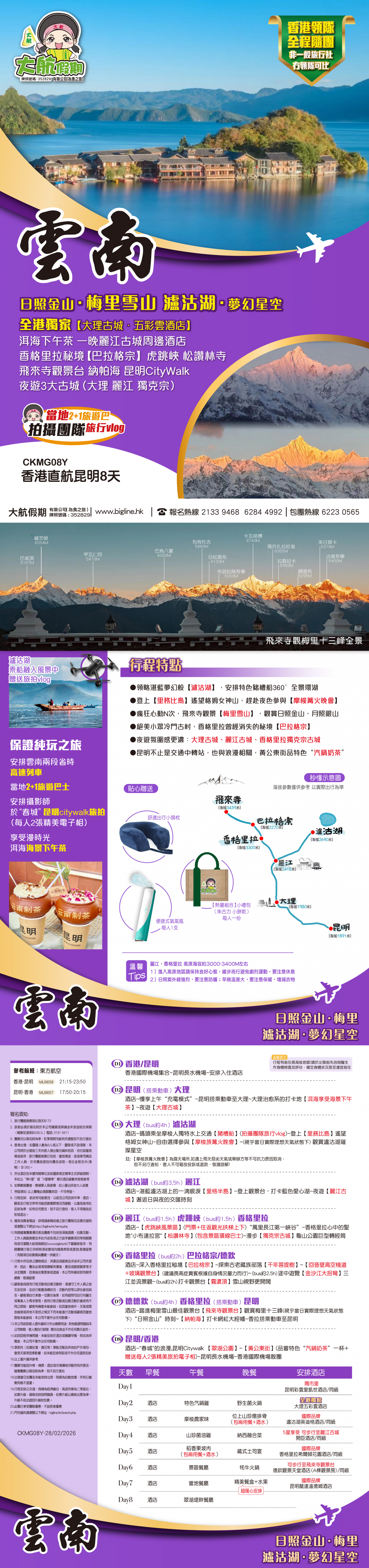 *團員繳付退票費後 (如適用): 1) 已繳款項可保留半年; 或 2) 選擇轉團後, 餘款則保留半年; 或 3) 可繳付『迫不得已理由』之手續費後, 取回已付餘款。 *個別機票+酒店套票產品如因『迫不得已理由』取消外遊行程, 處理旅客退款時亦按以上訂列收取每位退票費及手續費, 並以行程表 (套票單張) 所列為準。 責任細則: 1. 本公司保留合併團隊出發的權利。 2. 行程書或單張內所列費用根據當時機票價格及國際貨幣兌換率而訂立。外幣浮動等情況之下, 本公司保留在出發前調整各項費用的權利及徵收額外費用。 3. 所有列出的交通服務資料只供參考, 如有更改概不負責, 一切須以出票時為準。 4. 除本公司直接提供之服務外, 本公司及其職員或附屬公司或與本公司有經營關係之公司代理人身份在香港或外地安排其他獨立機構所提供之交通工具 (如飛機、輪船、火車、或遊覽巴士等) 、住宿、膳食或娛樂觀光項目等 (“委託機構”), 團員如遇交通延誤、行李遺失、意外傷亡或財物損失等, 該依照當地法律向擁有、管理或操作之委託機構直接交涉或追討賠償, 通常該等機構均各訂位不同條例, 以對客人負責。在此情況下, 本公司概不對該等損失或傷亡負責。 5. 除因由本公司之員工或其他直接管理或操作之機構之疏忽而引致團員之個人傷亡外, 本公司對團員在任何意外中之個人傷亡、經濟、娛樂或精神損失概不負責。 6. 除經本公司同意及安排, 如團員自行更改由其他人士代為參團, 本公司或其委託機構之職員有權取消其隨團之資格, 而無須發還任何團費, 而該人士在隨團期間之保險、責任賠償、行為後果等均由該人仕自行承擔。 7. 如因天氣、罷工、戰爭、怠工或安全情況影響而引致有關交通工具暫停服務, 停航或其他事故, 而必須將行程更改或取消部份行程, 本公司則將團員所繳交之費用扣除因以上事故而引致之損失後, 退回差額給團員。 8. 有關住宿、膳食、遊覽節目等問題, 均依據行程表安排, 行程先後次序有可能需要更改, 一切以當地安排為準。若遇特殊情況, 如簽證受阻, 當地酒店突告客滿或航機改變飛行時間或地點, 以及非本公司或其委託機構所能控制之因素, 令旅行團節目有增減, 或臨時更改交通工具、班機時間、機種及更換酒店等等, 本公司或其委託機構得依當時情況全權盡力處理, 團員不得藉故反對或退出, 因故取消之節目, 將不獲退還款項, 任何因延期而引致之額外支出, 本公司或其委託機構概不負責。 9. 所有酒店及住宿根據行程安排, 本公司視乎當時情形作出更改, 但不限於遇展覽會或特殊情況下, 將住宿鄰近城市之同等級酒店及住宿代替。本公司如因『迫不得已理由(外遊)』(即指戰爭、政治動盪、恐怖襲擊、天災、疫症、惡劣天氣、交通工具發生技術問題、載運機構臨時更改班次或取消服務、罷工、工業行動、旅遊目的地政府或世界衛生組織發出旅遊警示(警告)、香港特別行政區政府發出紅色或黑色外遊警示、不可抗力事件,以及業界不能控制的其他不利離開香港或在香港境外旅遊的情況)於外遊旅行團出發後更改任何項目而引致成本增加,可向顧客徵收額外費用。 10. 【已成團】代表該團號之指定出發日期預訂機位或已有足夠人數報名參加。但出發與否還受其他因素影響, 本公司保留最終決定權。 11. 任何團員在參與各項活動時, 如經常不遵守服飾人員之指引或安排, 在行動或言語上侮辱或滋擾其他團員或工作人員, 本公司或其委託機構職員有權視具體情況而取消其隨團資格而母須發任何團費, 而受該旅客監護之18歲以下同行團員亦須一併離開, 有關旅客離團後一切活動, 概與本公司或其委託機構無關。 12. 團員如欲於旅程完畢後延期返港, 須於出發前十四天提出, 以便本公司代為預定返港機位, 延期返港之機位, 未能即時作實, 團員不得藉此理由要求退出, 旅程完畢後延期逗留之費用, 概由團員自負。 13. 延期返港之團友, 必須在離境前七十二小時向航空公司確實回程機位, 任何機位如有變更, 概與本公司無關。 14. 團員如在旅途中自行離團或放棄行程, 離團後之責任自負, 一切後果與本公司或其委託機構無關。 15. 參團者須切實遵守各國及各地法例, 包括但不限於防疫防控條例, 並嚴禁攜帶違例物品出入境, 並照實申報攜帶之物品及現金。 16. 任何種類的簽證審批權及出入境批准權一律由該國或地區之領事館及/或出入境部門全權決定, 出入境如有問題, 責任旅客自負, 本公司或其委託機構母須負任何責任。如簽證已代辦, 簽證費恕不退還。 17. 即使團員持有效之入境簽證及旅遊證件, 而於入境時被當值之移民局海關人員拒絕入境, 本公司或其委託機構亦無須負任何責任。所需額外安排之食宿、交通費用、全部由其本人負責, 其餘下的行程亦將不會獲得任何補償, 亦不得要求退款或改團。 18. 中國內地相關法規規定, 即日起旅客入住中國內地境內酒店時, 公安機關會透過酒店前台向旅客一併採集人像信息資訊。 19. 如出現一些非本公司能力範圍可控制之問題 (如花卉、紅葉提早凋謝或景觀、自然現象、景點活動或戶外項目) 會受天氣等因素影響, 如未能安排則取消不作任何退款安排。 20. 旅客如在旅程中確診 COVID-19或其他傳染病,無論受到當地政府隔離或其他檢疫要求影響與否,為確保其他旅客之安全,確診旅
