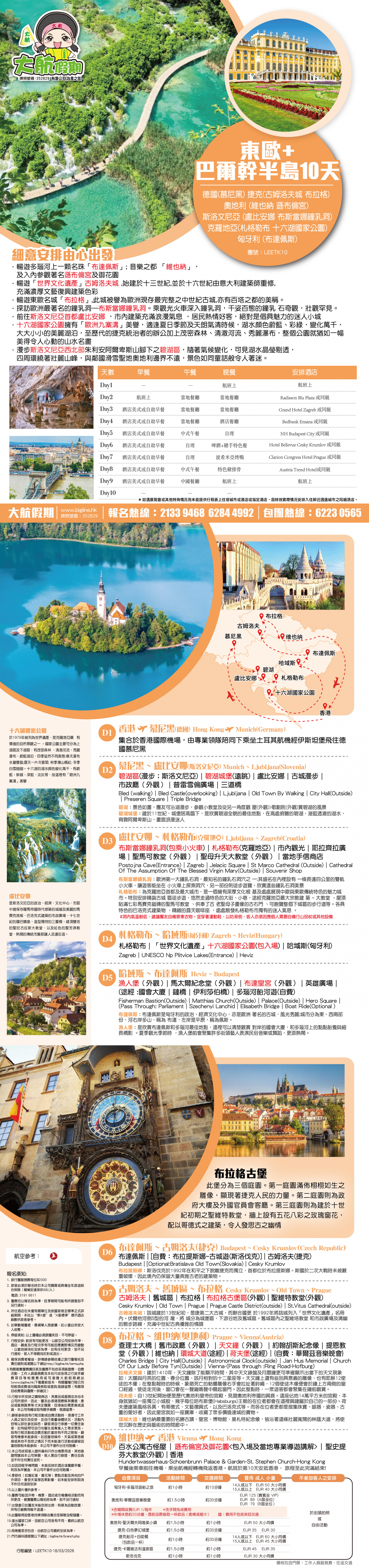 6. 團費及其他相關費用包括但不限於:稅項、機場保安費、旅行團服務費、郵輪服務費、旅遊保險的保費、有關簽證及其相關費用(包括但不限於簽證費及代辦簽證的服務費/手續費)須在出發前21天繳清, 長線則為30天前 (旺季期間須在出發前30天繳付, 長線則為 45天前), 個別線路亦將因應不同供應商之經營條件而作出調整,以該團的單張資料為準; 逾期未清繳費用者, 本公司得將訂位作廢, 所繳訂金例不發還, 亦不得將訂金轉予他人或轉用於其他日子出發及其他旅行團。 7. 付款方式以各訂購渠道之系統可接受為準。 8. 所有一切代收之款項,包括但不限於燃油附加費、香港及各地機場稅和機場建設稅等, 本公司只接受以現金或易辦事繳付所有代收費用。 - 信用卡/分期付款計劃或銀聯卡付款, 以銀行確認成功過賬, 方可作實。 - 請保留收據, 以作退款之憑據, 如以信用卡免息分期或銀聯卡付款, 則退款必須經由銀行辦理手續, 退回該信用卡/銀行戶口, 需時最少約三十五個工作天, 退款時間及一切有關條款均由信用卡公司決定。 9. 鑑於外幣浮動、因燃油附加費的浮動以致機票成本增加、或因事前未能預見的情況(包括但不限於交通票、酒店、保險等方面)導致成本上升, 本公司保留權利在顧客繳付全部團費及其他相關費用前向有關顧客徵收額外費用。價格如有更改, 將會另行通知。燃油附加費價格以航空公司最後公佈為準。一切費用必須於出發前全數繳付。 10. 減免折扣優惠, 必須於報名時申請及提供證明予本公司, 概不補發。 11. 當地參團之團費不設任何優惠。團員亦須自備國際機票、所有內陸機票及個別路線之部份交通安排。 12. 本公司收費上的年齡定義 : 0至23 個月為嬰兒; 2至11歲為小童 (根據不同線路釐定小童的年齡定義) ; 12歲或以上為成人。 13. 對未滿 18歲的顧客須符合下列報名要求: - 15 歲以下, 必須與父母及監護人同行 - 滿 15歲而未滿 18歲; 如非與父母或監護人同行, 則必須由父母及監護人同意並於報名表簽署作實及具備一份合適的旅遊綜合保險。 14. 各項交通服務供應商對乘載最高懷孕週數之孕婦或最低參加年齡之嬰兒各有所不同, 詳情請向本公司職員查詢。 15. 交通服務供應商可視乎顧客健康狀況, 要求醫療證明及或有效期內的新冠病毒陰性證明以示適合乘搭該交通, 並保留拒絕顧客登乘之權利。 16. 本公司保留接受報名與否之最終權利。 17. 所有團隊不包旅遊保險,本公司要求客人報名時須同時購買個人旅遊保險(廣東省旅行團除外),如客人自備個人全年旅遊保險則可豁免。廣東省旅行團如客人選擇不購買旅遊保險,閣下之人生及財物安全必須自理,責任概與旅行社無關。如客人非透過本公司購買個人旅遊保險而又要求本公司發出有關保險證明,則須收取港幣$100/人作為手續費。 費用包括: 1. 機票:來回經濟客位機票。(飛機線適用) 2. 酒店:根據行程表內所列之酒店或同級,以兩人共用一房為標準。單人房附加費則以一人佔一房為準。 3. 膳食:行程表內所列之團餐,交通服務供應商所提供之膳食則以其最終安排為準。 4. 鐵路 : 行程表所列之鐵路車票。 5. 交通:採用空氣調節遊覽車,開關冷暖氣需根據當地條例執行。 6. 觀光:各項遊覽節目均按照行程表內所列之遊覽節目及入場費用為根據。 7. 導遊 : 專業領隊/導遊隨團出發, 沿途安排及介紹。本公司於特殊情況下, 保留派領隊隨團出發之最終決定權, 團員不得籍故反對或退出。 8. 行李 : 每位限攜帶手提行李一件, 規格以交通服務供應商為準。寄艙行李數量及重量需視乎交通服務供應商而定, 如行李額外超重, 費用需由客人承擔。 9. 嬰兒收費只包括交通服務供應商出票費,不包括機位或座位、酒店、膳食及其他佔用座位之交通等安排。為免生疑問,本公司將不會為嬰兒額外提供團餐、酒店床位及任何交通公具(包括但不限於旅遊巴)的座位。如旅客要求提供嬰兒床,本公司將協助旅客向酒店要求安排,但酒店方面保留最終決定權。 費用不包括: 1. 旅遊證件及各國入境簽證費用。 2. 給予導遊/領隊/司機/工作人員之旅行團服務費。 3. 各地機場稅、額外附加費及指定稅項。 4. 行李超重費用。 5. 旅遊業監管印花成本。 6. 酒店、機場及各類交通工具之行李生服務費。 7. 自費項目或行程表以外之觀光節目。 8. 因交通阻延、罷工、颱風或其他突發情況而非本公司所能控制而引致之額外費用。 9. 綜合旅遊保險。為使各旅客獲得完善的旅遊保障,本公司建議必須自行購買綜合旅遊保險。 臨時取消及退款細則: 1. 本公司有權在旅行團出發前取消旅行團 (如參加人數不足 15人) 。在此等情況下, 本公司將按照下列規定處理:(取消3天或以下的旅行團)最少於出發前一日通知顧客;(取消4至9天的旅行團)最少於出發前七日通知顧客;(取消10天或以上的旅行團)最少於出發前14日通知顧客(通知顧客及出發當日均不計),以上不包括旺季及大假期的取消旅遊團安排,並於發出取消通知後的七個工作日內(發出通知當日不計)全數退還或安排退還團員所繳交之費用 (已獲領事館簽發之獨立簽證費用除外) 。如本公司沒有在按本段所述的期限內就取消旅行團通知顧客,本公司將於發出取消通知後的七個工作日內(發出通知當日不計),退還顧客所繳付的款項,及賠償團費的15%(以港幣1,000 元為上限)。為免生疑問,除
