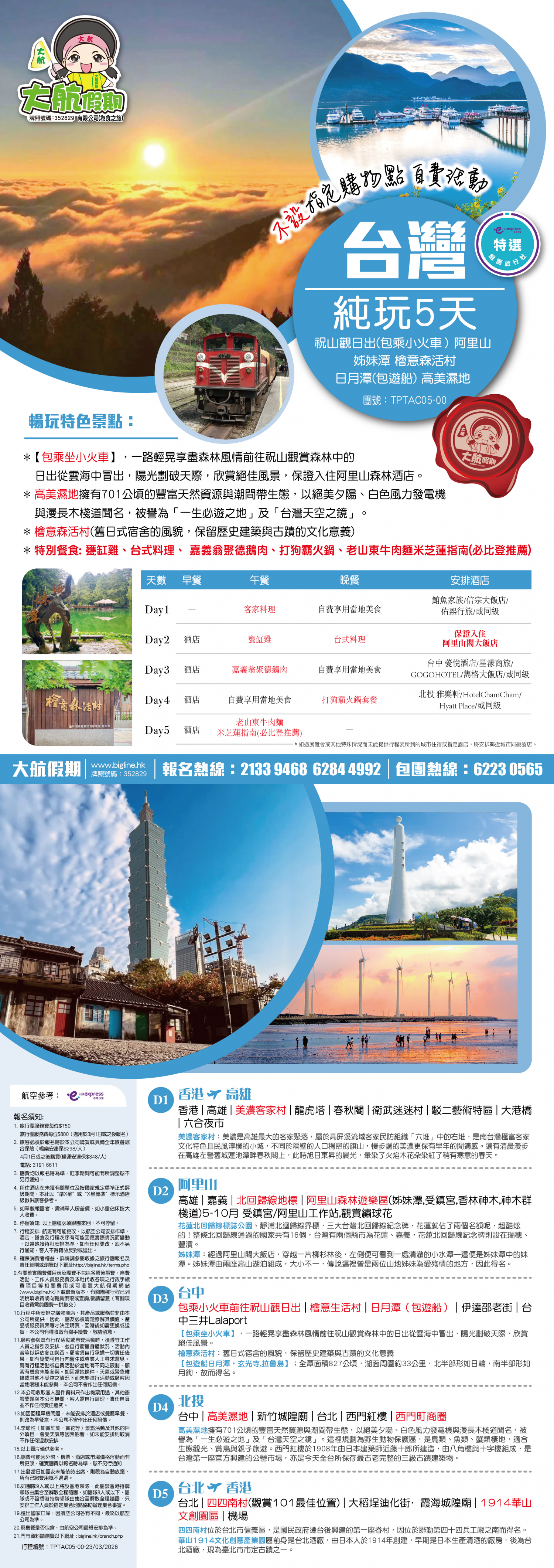 *團員繳付退票費後 (如適用): 1) 已繳款項可保留半年; 或 2) 選擇轉團後, 餘款則保留半年; 或 3) 可繳付『迫不得已理由』之手續費後, 取回已付餘款。 *個別機票+酒店套票產品如因『迫不得已理由』取消外遊行程, 處理旅客退款時亦按以上訂列收取每位退票費及手續費, 並以行程表 (套票單張) 所列為準。 責任細則: 1. 本公司保留合併團隊出發的權利。 2. 行程書或單張內所列費用根據當時機票價格及國際貨幣兌換率而訂立。外幣浮動等情況之下, 本公司保留在出發前調整各項費用的權利及徵收額外費用。 3. 所有列出的交通服務資料只供參考, 如有更改概不負責, 一切須以出票時為準。 4. 除本公司直接提供之服務外, 本公司及其職員或附屬公司或與本公司有經營關係之公司代理人身份在香港或外地安排其他獨立機構所提供之交通工具 (如飛機、輪船、火車、或遊覽巴士等) 、住宿、膳食或娛樂觀光項目等 (“委託機構”), 團員如遇交通延誤、行李遺失、意外傷亡或財物損失等, 該依照當地法律向擁有、管理或操作之委託機構直接交涉或追討賠償, 通常該等機構均各訂位不同條例, 以對客人負責。在此情況下, 本公司概不對該等損失或傷亡負責。 5. 除因由本公司之員工或其他直接管理或操作之機構之疏忽而引致團員之個人傷亡外, 本公司對團員在任何意外中之個人傷亡、經濟、娛樂或精神損失概不負責。 6. 除經本公司同意及安排, 如團員自行更改由其他人士代為參團, 本公司或其委託機構之職員有權取消其隨團之資格, 而無須發還任何團費, 而該人士在隨團期間之保險、責任賠償、行為後果等均由該人仕自行承擔。 7. 如因天氣、罷工、戰爭、怠工或安全情況影響而引致有關交通工具暫停服務, 停航或其他事故, 而必須將行程更改或取消部份行程, 本公司則將團員所繳交之費用扣除因以上事故而引致之損失後, 退回差額給團員。 8. 有關住宿、膳食、遊覽節目等問題, 均依據行程表安排, 行程先後次序有可能需要更改, 一切以當地安排為準。若遇特殊情況, 如簽證受阻, 當地酒店突告客滿或航機改變飛行時間或地點, 以及非本公司或其委託機構所能控制之因素, 令旅行團節目有增減, 或臨時更改交通工具、班機時間、機種及更換酒店等等, 本公司或其委託機構得依當時情況全權盡力處理, 團員不得藉故反對或退出, 因故取消之節目, 將不獲退還款項, 任何因延期而引致之額外支出, 本公司或其委託機構概不負責。 9. 所有酒店及住宿根據行程安排, 本公司視乎當時情形作出更改, 但不限於遇展覽會或特殊情況下, 將住宿鄰近城市之同等級酒店及住宿代替。本公司如因『迫不得已理由(外遊)』(即指戰爭、政治動盪、恐怖襲擊、天災、疫症、惡劣天氣、交通工具發生技術問題、載運機構臨時更改班次或取消服務、罷工、工業行動、旅遊目的地政府或世界衛生組織發出旅遊警示(警告)、香港特別行政區政府發出紅色或黑色外遊警示、不可抗力事件,以及業界不能控制的其他不利離開香港或在香港境外旅遊的情況)於外遊旅行團出發後更改任何項目而引致成本增加,可向顧客徵收額外費用。 10. 【已成團】代表該團號之指定出發日期預訂機位或已有足夠人數報名參加。但出發與否還受其他因素影響, 本公司保留最終決定權。 11. 任何團員在參與各項活動時, 如經常不遵守服飾人員之指引或安排, 在行動或言語上侮辱或滋擾其他團員或工作人員, 本公司或其委託機構職員有權視具體情況而取消其隨團資格而母須發任何團費, 而受該旅客監護之18歲以下同行團員亦須一併離開, 有關旅客離團後一切活動, 概與本公司或其委託機構無關。 12. 團員如欲於旅程完畢後延期返港, 須於出發前十四天提出, 以便本公司代為預定返港機位, 延期返港之機位, 未能即時作實, 團員不得藉此理由要求退出, 旅程完畢後延期逗留之費用, 概由團員自負。 13. 延期返港之團友, 必須在離境前七十二小時向航空公司確實回程機位, 任何機位如有變更, 概與本公司無關。 14. 團員如在旅途中自行離團或放棄行程, 離團後之責任自負, 一切後果與本公司或其委託機構無關。 15. 參團者須切實遵守各國及各地法例, 包括但不限於防疫防控條例, 並嚴禁攜帶違例物品出入境, 並照實申報攜帶之物品及現金。 16. 任何種類的簽證審批權及出入境批准權一律由該國或地區之領事館及/或出入境部門全權決定, 出入境如有問題, 責任旅客自負, 本公司或其委託機構母須負任何責任。如簽證已代辦, 簽證費恕不退還。 17. 即使團員持有效之入境簽證及旅遊證件, 而於入境時被當值之移民局海關人員拒絕入境, 本公司或其委託機構亦無須負任何責任。所需額外安排之食宿、交通費用、全部由其本人負責, 其餘下的行程亦將不會獲得任何補償, 亦不得要求退款或改團。 18. 中國內地相關法規規定, 即日起旅客入住中國內地境內酒店時, 公安機關會透過酒店前台向旅客一併採集人像信息資訊。 19. 如出現一些非本公司能力範圍可控制之問題 (如花卉、紅葉提早凋謝或景觀、自然現象、景點活動或戶外項目) 會受天氣等因素影響, 如未能安排則取消不作任何退款安排。 20. 旅客如在旅程中確診 COVID-19或其他傳染病,無論受到當地政府隔離或其他檢疫要求影響與否,為確保其他旅客之安全,確診旅