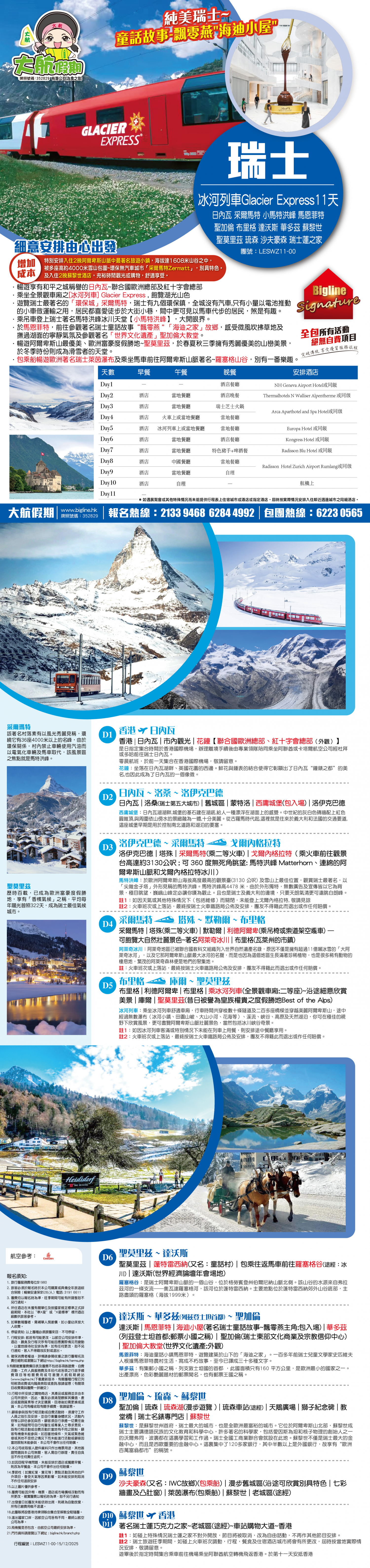 6. 團費及其他相關費用包括但不限於:稅項、機場保安費、旅行團服務費、郵輪服務費、旅遊保險的保費、有關簽證及其相關費用(包括但不限於簽證費及代辦簽證的服務費/手續費)須在出發前21天繳清, 長線則為30天前 (旺季期間須在出發前30天繳付, 長線則為 45天前), 個別線路亦將因應不同供應商之經營條件而作出調整,以該團的單張資料為準; 逾期未清繳費用者, 本公司得將訂位作廢, 所繳訂金例不發還, 亦不得將訂金轉予他人或轉用於其他日子出發及其他旅行團。 7. 付款方式以各訂購渠道之系統可接受為準。 8. 所有一切代收之款項,包括但不限於燃油附加費、香港及各地機場稅和機場建設稅等, 本公司只接受以現金或易辦事繳付所有代收費用。 - 信用卡/分期付款計劃或銀聯卡付款, 以銀行確認成功過賬, 方可作實。 - 請保留收據, 以作退款之憑據, 如以信用卡免息分期或銀聯卡付款, 則退款必須經由銀行辦理手續, 退回該信用卡/銀行戶口, 需時最少約三十五個工作天, 退款時間及一切有關條款均由信用卡公司決定。 9. 鑑於外幣浮動、因燃油附加費的浮動以致機票成本增加、或因事前未能預見的情況(包括但不限於交通票、酒店、保險等方面)導致成本上升, 本公司保留權利在顧客繳付全部團費及其他相關費用前向有關顧客徵收額外費用。價格如有更改, 將會另行通知。燃油附加費價格以航空公司最後公佈為準。一切費用必須於出發前全數繳付。 10. 減免折扣優惠, 必須於報名時申請及提供證明予本公司, 概不補發。 11. 當地參團之團費不設任何優惠。團員亦須自備國際機票、所有內陸機票及個別路線之部份交通安排。 12. 本公司收費上的年齡定義 : 0至23 個月為嬰兒; 2至11歲為小童 (根據不同線路釐定小童的年齡定義) ; 12歲或以上為成人。 13. 對未滿 18歲的顧客須符合下列報名要求: - 15 歲以下, 必須與父母及監護人同行 - 滿 15歲而未滿 18歲; 如非與父母或監護人同行, 則必須由父母及監護人同意並於報名表簽署作實及具備一份合適的旅遊綜合保險。 14. 各項交通服務供應商對乘載最高懷孕週數之孕婦或最低參加年齡之嬰兒各有所不同, 詳情請向本公司職員查詢。 15. 交通服務供應商可視乎顧客健康狀況, 要求醫療證明及或有效期內的新冠病毒陰性證明以示適合乘搭該交通, 並保留拒絕顧客登乘之權利。 16. 本公司保留接受報名與否之最終權利。 17. 所有團隊不包旅遊保險,本公司要求客人報名時須同時購買個人旅遊保險(廣東省旅行團除外),如客人自備個人全年旅遊保險則可豁免。廣東省旅行團如客人選擇不購買旅遊保險,閣下之人生及財物安全必須自理,責任概與旅行社無關。如客人非透過本公司購買個人旅遊保險而又要求本公司發出有關保險證明,則須收取港幣$100/人作為手續費。 費用包括: 1. 機票:來回經濟客位機票。(飛機線適用) 2. 酒店:根據行程表內所列之酒店或同級,以兩人共用一房為標準。單人房附加費則以一人佔一房為準。 3. 膳食:行程表內所列之團餐,交通服務供應商所提供之膳食則以其最終安排為準。 4. 鐵路 : 行程表所列之鐵路車票。 5. 交通:採用空氣調節遊覽車,開關冷暖氣需根據當地條例執行。 6. 觀光:各項遊覽節目均按照行程表內所列之遊覽節目及入場費用為根據。 7. 導遊 : 專業領隊/導遊隨團出發, 沿途安排及介紹。本公司於特殊情況下, 保留派領隊隨團出發之最終決定權, 團員不得籍故反對或退出。 8. 行李 : 每位限攜帶手提行李一件, 規格以交通服務供應商為準。寄艙行李數量及重量需視乎交通服務供應商而定, 如行李額外超重, 費用需由客人承擔。 9. 嬰兒收費只包括交通服務供應商出票費,不包括機位或座位、酒店、膳食及其他佔用座位之交通等安排。為免生疑問,本公司將不會為嬰兒額外提供團餐、酒店床位及任何交通公具(包括但不限於旅遊巴)的座位。如旅客要求提供嬰兒床,本公司將協助旅客向酒店要求安排,但酒店方面保留最終決定權。 費用不包括: 1. 旅遊證件及各國入境簽證費用。 2. 給予導遊/領隊/司機/工作人員之旅行團服務費。 3. 各地機場稅、額外附加費及指定稅項。 4. 行李超重費用。 5. 旅遊業監管印花成本。 6. 酒店、機場及各類交通工具之行李生服務費。 7. 自費項目或行程表以外之觀光節目。 8. 因交通阻延、罷工、颱風或其他突發情況而非本公司所能控制而引致之額外費用。 9. 綜合旅遊保險。為使各旅客獲得完善的旅遊保障,本公司建議必須自行購買綜合旅遊保險。 臨時取消及退款細則: 1. 本公司有權在旅行團出發前取消旅行團 (如參加人數不足 15人) 。在此等情況下, 本公司將按照下列規定處理:(取消3天或以下的旅行團)最少於出發前一日通知顧客;(取消4至9天的旅行團)最少於出發前七日通知顧客;(取消10天或以上的旅行團)最少於出發前14日通知顧客(通知顧客及出發當日均不計),以上不包括旺季及大假期的取消旅遊團安排,並於發出取消通知後的七個工作日內(發出通知當日不計)全數退還或安排退還團員所繳交之費用 (已獲領事館簽發之獨立簽證費用除外) 。如本公司沒有在按本段所述的期限內就取消旅行團通知顧客,本公司將於發出取消通知後的七個工作日內(發出通知當日不計),退還顧客所繳付的款項,及賠償團費的15%(以港幣1,000 元為上限)。為免生疑問,除