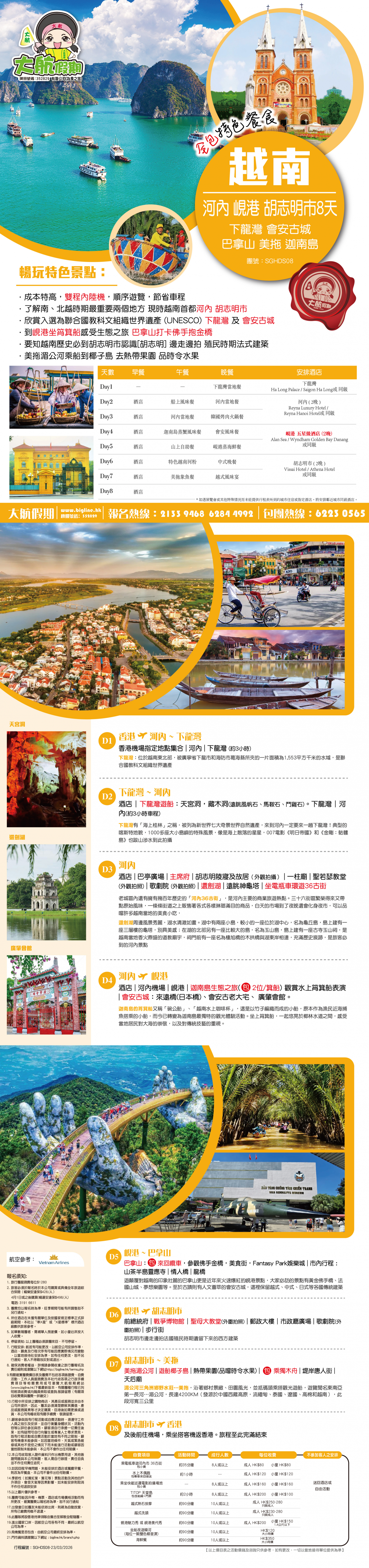 *團員繳付退票費後 (如適用): 1) 已繳款項可保留半年; 或 2) 選擇轉團後, 餘款則保留半年; 或 3) 可繳付『迫不得已理由』之手續費後, 取回已付餘款。 *個別機票+酒店套票產品如因『迫不得已理由』取消外遊行程, 處理旅客退款時亦按以上訂列收取每位退票費及手續費, 並以行程表 (套票單張) 所列為準。 責任細則: 1. 本公司保留合併團隊出發的權利。 2. 行程書或單張內所列費用根據當時機票價格及國際貨幣兌換率而訂立。外幣浮動等情況之下, 本公司保留在出發前調整各項費用的權利及徵收額外費用。 3. 所有列出的交通服務資料只供參考, 如有更改概不負責, 一切須以出票時為準。 4. 除本公司直接提供之服務外, 本公司及其職員或附屬公司或與本公司有經營關係之公司代理人身份在香港或外地安排其他獨立機構所提供之交通工具 (如飛機、輪船、火車、或遊覽巴士等) 、住宿、膳食或娛樂觀光項目等 (“委託機構”), 團員如遇交通延誤、行李遺失、意外傷亡或財物損失等, 該依照當地法律向擁有、管理或操作之委託機構直接交涉或追討賠償, 通常該等機構均各訂位不同條例, 以對客人負責。在此情況下, 本公司概不對該等損失或傷亡負責。 5. 除因由本公司之員工或其他直接管理或操作之機構之疏忽而引致團員之個人傷亡外, 本公司對團員在任何意外中之個人傷亡、經濟、娛樂或精神損失概不負責。 6. 除經本公司同意及安排, 如團員自行更改由其他人士代為參團, 本公司或其委託機構之職員有權取消其隨團之資格, 而無須發還任何團費, 而該人士在隨團期間之保險、責任賠償、行為後果等均由該人仕自行承擔。 7. 如因天氣、罷工、戰爭、怠工或安全情況影響而引致有關交通工具暫停服務, 停航或其他事故, 而必須將行程更改或取消部份行程, 本公司則將團員所繳交之費用扣除因以上事故而引致之損失後, 退回差額給團員。 8. 有關住宿、膳食、遊覽節目等問題, 均依據行程表安排, 行程先後次序有可能需要更改, 一切以當地安排為準。若遇特殊情況, 如簽證受阻, 當地酒店突告客滿或航機改變飛行時間或地點, 以及非本公司或其委託機構所能控制之因素, 令旅行團節目有增減, 或臨時更改交通工具、班機時間、機種及更換酒店等等, 本公司或其委託機構得依當時情況全權盡力處理, 團員不得藉故反對或退出, 因故取消之節目, 將不獲退還款項, 任何因延期而引致之額外支出, 本公司或其委託機構概不負責。 9. 所有酒店及住宿根據行程安排, 本公司視乎當時情形作出更改, 但不限於遇展覽會或特殊情況下, 將住宿鄰近城市之同等級酒店及住宿代替。本公司如因『迫不得已理由(外遊)』(即指戰爭、政治動盪、恐怖襲擊、天災、疫症、惡劣天氣、交通工具發生技術問題、載運機構臨時更改班次或取消服務、罷工、工業行動、旅遊目的地政府或世界衛生組織發出旅遊警示(警告)、香港特別行政區政府發出紅色或黑色外遊警示、不可抗力事件,以及業界不能控制的其他不利離開香港或在香港境外旅遊的情況)於外遊旅行團出發後更改任何項目而引致成本增加,可向顧客徵收額外費用。 10. 【已成團】代表該團號之指定出發日期預訂機位或已有足夠人數報名參加。但出發與否還受其他因素影響, 本公司保留最終決定權。 11. 任何團員在參與各項活動時, 如經常不遵守服飾人員之指引或安排, 在行動或言語上侮辱或滋擾其他團員或工作人員, 本公司或其委託機構職員有權視具體情況而取消其隨團資格而母須發任何團費, 而受該旅客監護之18歲以下同行團員亦須一併離開, 有關旅客離團後一切活動, 概與本公司或其委託機構無關。 12. 團員如欲於旅程完畢後延期返港, 須於出發前十四天提出, 以便本公司代為預定返港機位, 延期返港之機位, 未能即時作實, 團員不得藉此理由要求退出, 旅程完畢後延期逗留之費用, 概由團員自負。 13. 延期返港之團友, 必須在離境前七十二小時向航空公司確實回程機位, 任何機位如有變更, 概與本公司無關。 14. 團員如在旅途中自行離團或放棄行程, 離團後之責任自負, 一切後果與本公司或其委託機構無關。 15. 參團者須切實遵守各國及各地法例, 包括但不限於防疫防控條例, 並嚴禁攜帶違例物品出入境, 並照實申報攜帶之物品及現金。 16. 任何種類的簽證審批權及出入境批准權一律由該國或地區之領事館及/或出入境部門全權決定, 出入境如有問題, 責任旅客自負, 本公司或其委託機構母須負任何責任。如簽證已代辦, 簽證費恕不退還。 17. 即使團員持有效之入境簽證及旅遊證件, 而於入境時被當值之移民局海關人員拒絕入境, 本公司或其委託機構亦無須負任何責任。所需額外安排之食宿、交通費用、全部由其本人負責, 其餘下的行程亦將不會獲得任何補償, 亦不得要求退款或改團。 18. 中國內地相關法規規定, 即日起旅客入住中國內地境內酒店時, 公安機關會透過酒店前台向旅客一併採集人像信息資訊。 19. 如出現一些非本公司能力範圍可控制之問題 (如花卉、紅葉提早凋謝或景觀、自然現象、景點活動或戶外項目) 會受天氣等因素影響, 如未能安排則取消不作任何退款安排。 20. 旅客如在旅程中確診 COVID-19或其他傳染病,無論受到當地政府隔離或其他檢疫要求影響與否,為確保其他旅客之安全,確診旅