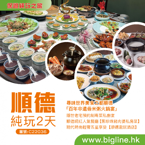 | 第1天 | 百年非遺毋米粥火鍋宴 | 隱世老宅預約制粵菜私廚宴 | 佛山市順德瀧居酒店 | |