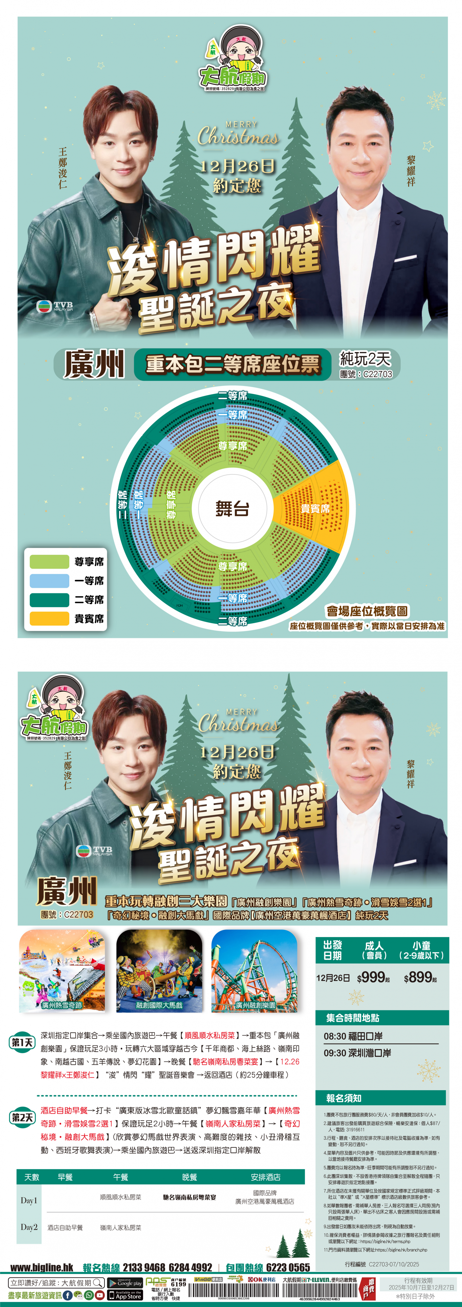 【12.26 黎耀祥x王鄭浚仁】《尊享席座位票》重本玩轉4大至HIT熱點 2025年全新開業『清遠長隆森林王國』『廣東宋城千古情』『廣州熱雪奇跡·滑雪娛雪2選1』『融創國際大馬戲』純玩3天