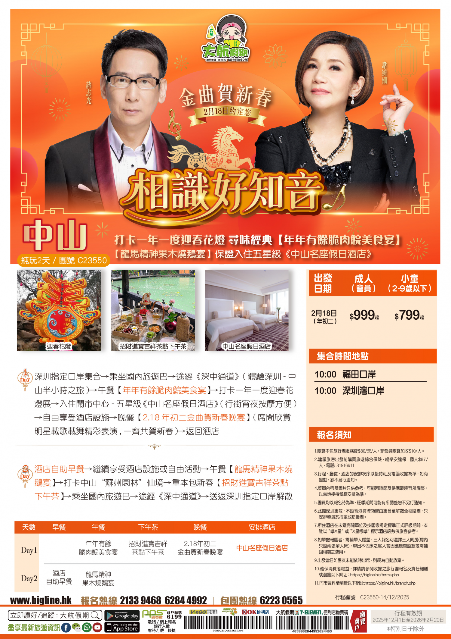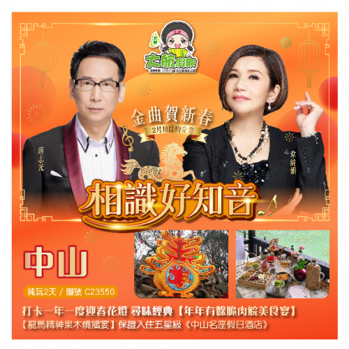 【2.18年初二晚會】蔣志光&韋綺姍<相識好知音 金曲賀新春> 打卡一年一度迎春花燈 尋味經典【年年有餘脆肉鯇美食宴】【龍馬精神果木燒鵝宴】保證入住五星級《中山名座假日酒店》純玩2天