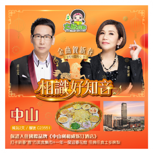 【2.18年初二晚會】蔣志光&韋綺姍<相識好知音 金曲賀新春> 打卡一年一度迎春花燈 尋味經典【年年有餘脆肉鯇美食宴】【龍馬精神果木燒鵝宴】保證入住五星級《中山名座假日酒店》純玩2天
