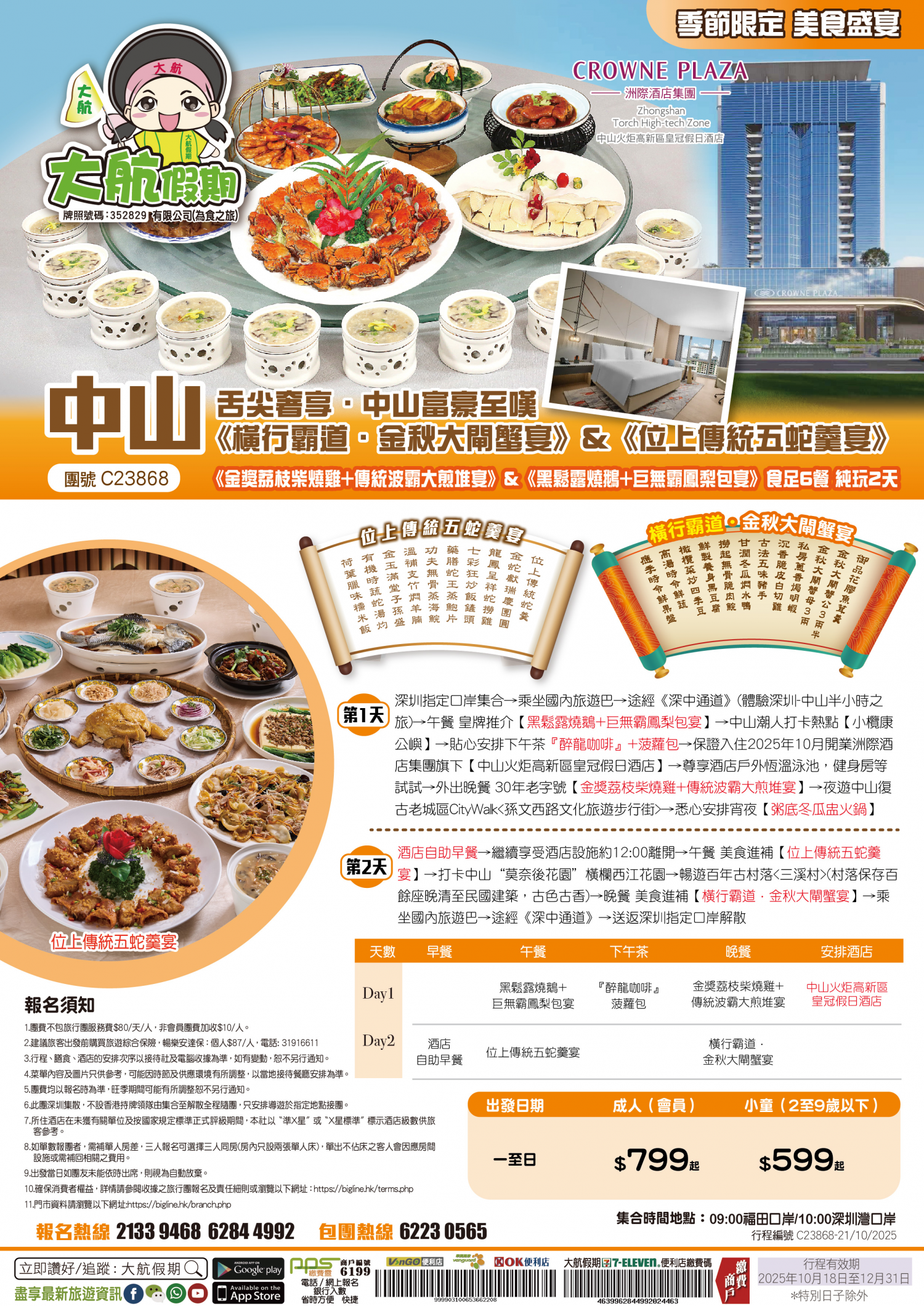 | 第2天 | 酒店自助早餐 | 位上傳統五蛇羹 | 橫行霸道·金秋大閘蟹宴 |