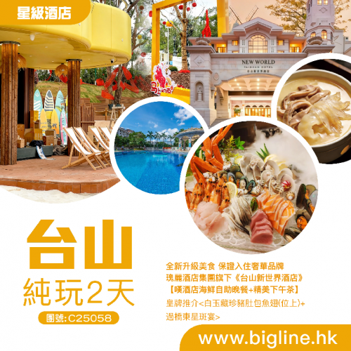 【星級酒店】全新升級美食 保證入住奢華品牌瑰麗酒店集團旗下《台山新世界酒店》【嘆酒店海鮮自助晚餐+精美下午茶】皇牌推介<白玉藏珍豬肚包魚翅(位上)+過橋東星斑宴> 純玩2天
