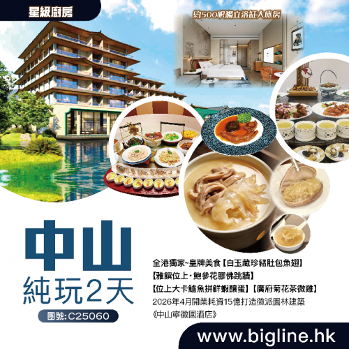 【星級廚房】全港獨家~皇牌美食【白玉藏珍豬肚包魚翅】【雅饌位上・鮑參花膠佛跳牆】【位上大卡鱸魚拼鮮蝦釀蛋】【廣府菊花茶微雞】2026年4月開業耗資15億打造微派園林建築《中山寧徽園酒店》純玩2天