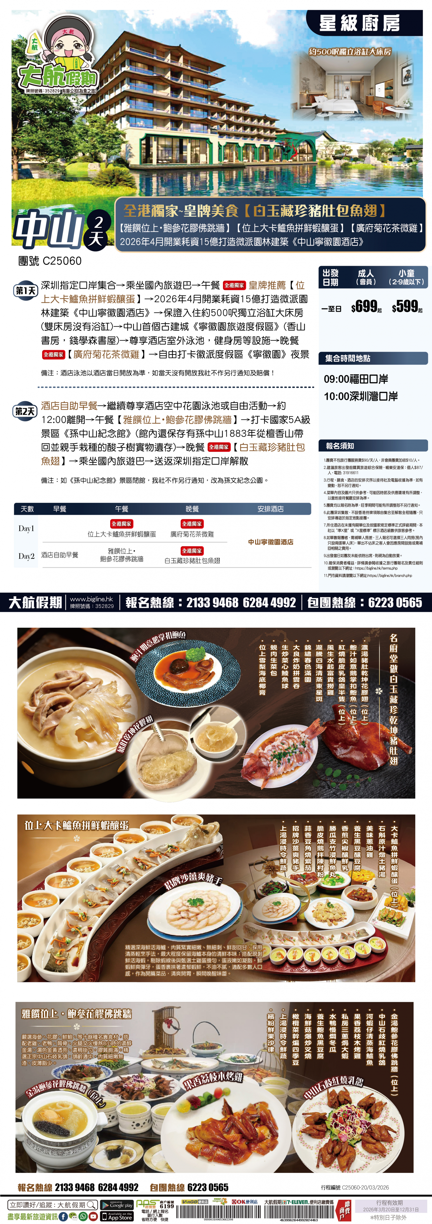 | 第2天 | 酒店自助早餐 | 雅饌位上・鮑參花膠佛跳牆 | 白玉藏珍豬肚包魚翅(位上)+過橋東星斑宴 |