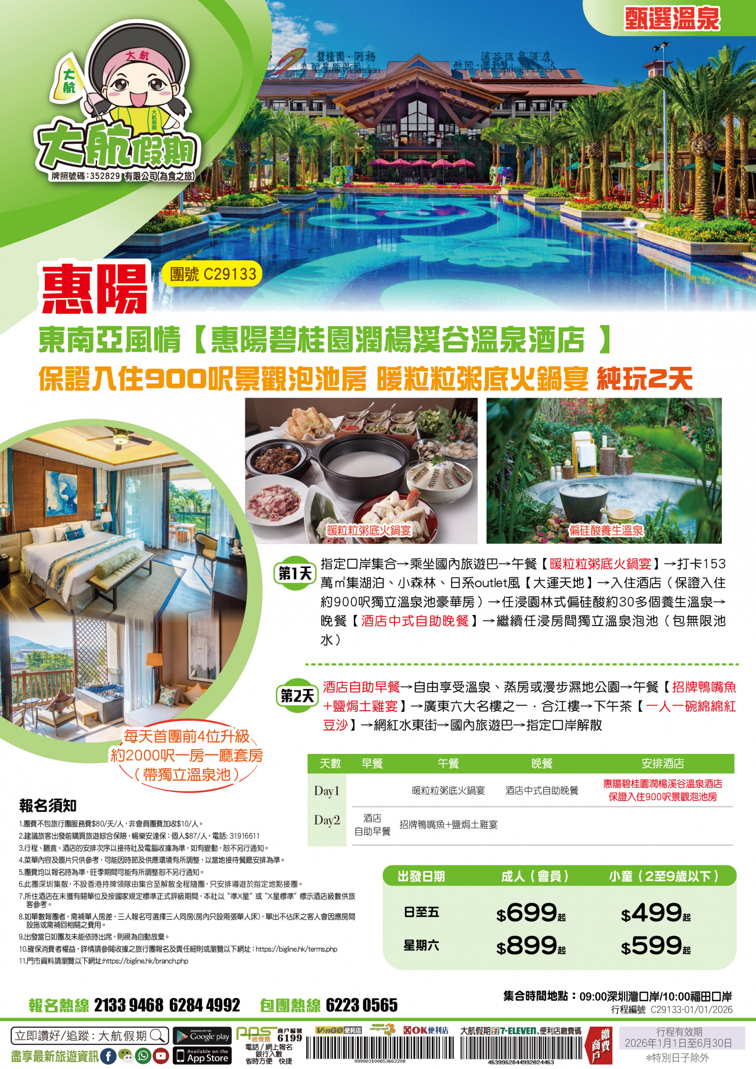 | 第1天 | 順德招牌粥底火鍋宴 | 酒店自助晚餐 | 惠州碧桂園潤楊溪谷溫泉酒店 | |
