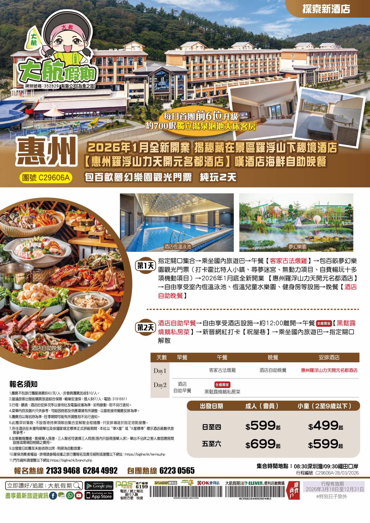 | 第1天 | 客家古法燉雞 | 酒店自助晚餐 | 惠州羅浮山力天開元名都酒店 | |