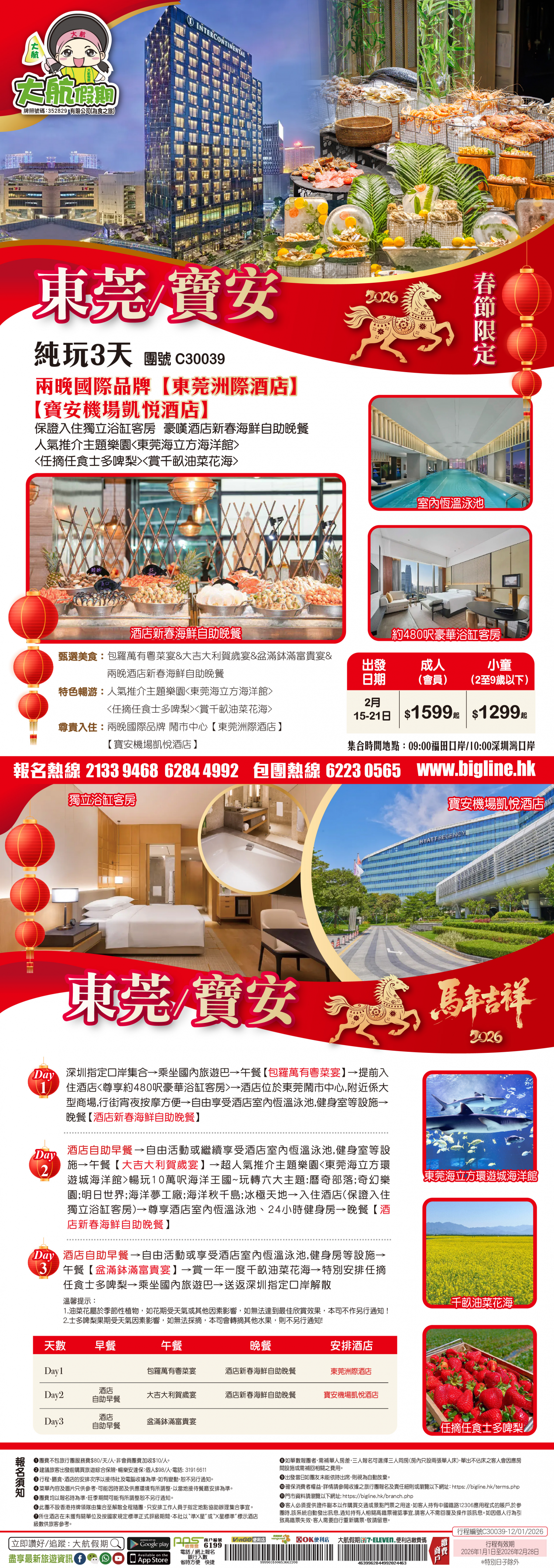 | 第2天 | 酒店自助早餐 | 大吉大利賀歲宴 | 酒店海鮮自助晚餐 | 深圳機場凱悅酒店 |