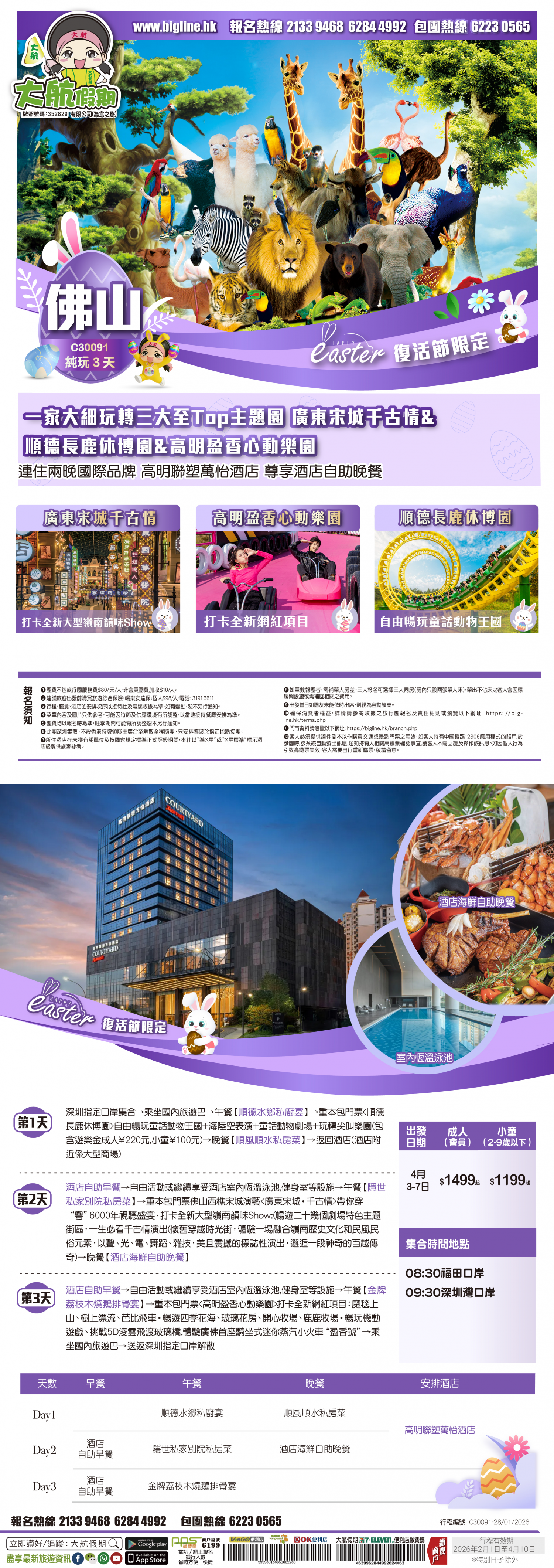 *團員繳付退票費後 (如適用): 1) 已繳款項可保留半年; 或 2) 選擇轉團後, 餘款則保留半年; 或 3) 可繳付『迫不得已理由』之手續費後, 取回已付餘款。 *個別機票+酒店套票產品如因『迫不得已理由』取消外遊行程, 處理旅客退款時亦按以上訂列收取每位退票費及手續費, 並以行程表 (套票單張) 所列為準。 責任細則: 1. 本公司保留合併團隊出發的權利。 2. 行程書或單張內所列費用根據當時機票價格及國際貨幣兌換率而訂立。外幣浮動等情況之下, 本公司保留在出發前調整各項費用的權利及徵收額外費用。 3. 所有列出的交通服務資料只供參考, 如有更改概不負責, 一切須以出票時為準。 4. 除本公司直接提供之服務外, 本公司及其職員或附屬公司或與本公司有經營關係之公司代理人身份在香港或外地安排其他獨立機構所提供之交通工具 (如飛機、輪船、火車、或遊覽巴士等) 、住宿、膳食或娛樂觀光項目等 (“委託機構”), 團員如遇交通延誤、行李遺失、意外傷亡或財物損失等, 該依照當地法律向擁有、管理或操作之委託機構直接交涉或追討賠償, 通常該等機構均各訂位不同條例, 以對客人負責。在此情況下, 本公司概不對該等損失或傷亡負責。 5. 除因由本公司之員工或其他直接管理或操作之機構之疏忽而引致團員之個人傷亡外, 本公司對團員在任何意外中之個人傷亡、經濟、娛樂或精神損失概不負責。 6. 除經本公司同意及安排, 如團員自行更改由其他人士代為參團, 本公司或其委託機構之職員有權取消其隨團之資格, 而無須發還任何團費, 而該人士在隨團期間之保險、責任賠償、行為後果等均由該人仕自行承擔。 7. 如因天氣、罷工、戰爭、怠工或安全情況影響而引致有關交通工具暫停服務, 停航或其他事故, 而必須將行程更改或取消部份行程, 本公司則將團員所繳交之費用扣除因以上事故而引致之損失後, 退回差額給團員。 8. 有關住宿、膳食、遊覽節目等問題, 均依據行程表安排, 行程先後次序有可能需要更改, 一切以當地安排為準。若遇特殊情況, 如簽證受阻, 當地酒店突告客滿或航機改變飛行時間或地點, 以及非本公司或其委託機構所能控制之因素, 令旅行團節目有增減, 或臨時更改交通工具、班機時間、機種及更換酒店等等, 本公司或其委託機構得依當時情況全權盡力處理, 團員不得藉故反對或退出, 因故取消之節目, 將不獲退還款項, 任何因延期而引致之額外支出, 本公司或其委託機構概不負責。 9. 所有酒店及住宿根據行程安排, 本公司視乎當時情形作出更改, 但不限於遇展覽會或特殊情況下, 將住宿鄰近城市之同等級酒店及住宿代替。本公司如因『迫不得已理由(外遊)』(即指戰爭、政治動盪、恐怖襲擊、天災、疫症、惡劣天氣、交通工具發生技術問題、載運機構臨時更改班次或取消服務、罷工、工業行動、旅遊目的地政府或世界衛生組織發出旅遊警示(警告)、香港特別行政區政府發出紅色或黑色外遊警示、不可抗力事件,以及業界不能控制的其他不利離開香港或在香港境外旅遊的情況)於外遊旅行團出發後更改任何項目而引致成本增加,可向顧客徵收額外費用。 10. 【已成團】代表該團號之指定出發日期預訂機位或已有足夠人數報名參加。但出發與否還受其他因素影響, 本公司保留最終決定權。 11. 任何團員在參與各項活動時, 如經常不遵守服飾人員之指引或安排, 在行動或言語上侮辱或滋擾其他團員或工作人員, 本公司或其委託機構職員有權視具體情況而取消其隨團資格而母須發任何團費, 而受該旅客監護之18歲以下同行團員亦須一併離開, 有關旅客離團後一切活動, 概與本公司或其委託機構無關。 12. 團員如欲於旅程完畢後延期返港, 須於出發前十四天提出, 以便本公司代為預定返港機位, 延期返港之機位, 未能即時作實, 團員不得藉此理由要求退出, 旅程完畢後延期逗留之費用, 概由團員自負。 13. 延期返港之團友, 必須在離境前七十二小時向航空公司確實回程機位, 任何機位如有變更, 概與本公司無關。 14. 團員如在旅途中自行離團或放棄行程, 離團後之責任自負, 一切後果與本公司或其委託機構無關。 15. 參團者須切實遵守各國及各地法例, 包括但不限於防疫防控條例, 並嚴禁攜帶違例物品出入境, 並照實申報攜帶之物品及現金。 16. 任何種類的簽證審批權及出入境批准權一律由該國或地區之領事館及/或出入境部門全權決定, 出入境如有問題, 責任旅客自負, 本公司或其委託機構母須負任何責任。如簽證已代辦, 簽證費恕不退還。 17. 即使團員持有效之入境簽證及旅遊證件, 而於入境時被當值之移民局海關人員拒絕入境, 本公司或其委託機構亦無須負任何責任。所需額外安排之食宿、交通費用、全部由其本人負責, 其餘下的行程亦將不會獲得任何補償, 亦不得要求退款或改團。 18. 中國內地相關法規規定, 即日起旅客入住中國內地境內酒店時, 公安機關會透過酒店前台向旅客一併採集人像信息資訊。 19. 如出現一些非本公司能力範圍可控制之問題 (如花卉、紅葉提早凋謝或景觀、自然現象、景點活動或戶外項目) 會受天氣等因素影響, 如未能安排則取消不作任何退款安排。 20. 旅客如在旅程中確診 COVID-19或其他傳染病,無論受到當地政府隔離或其他檢疫要求影響與否,為確保其他旅客之安全,確診旅