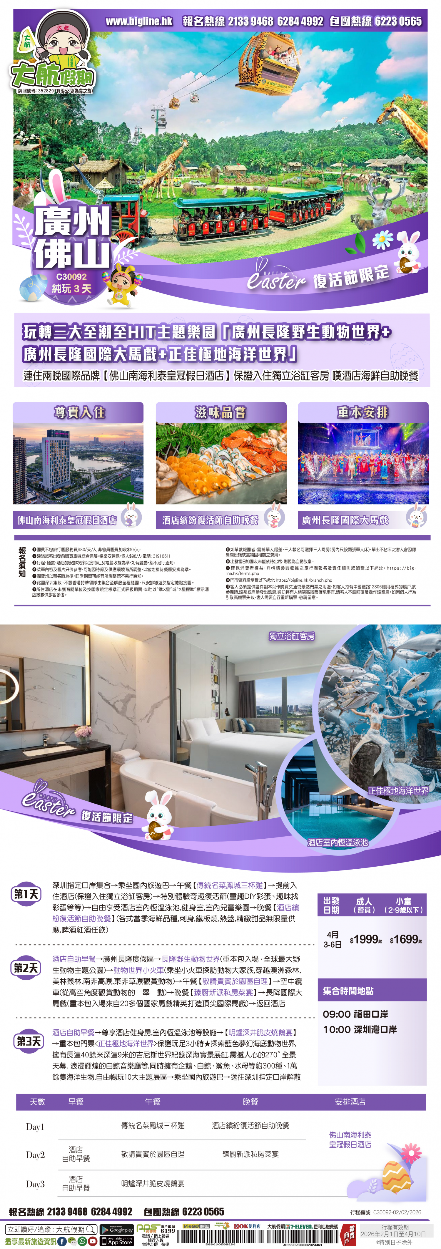 【復活節限定】重本包三大園區昂貴門票《珠海長隆海洋王國》《順德長鹿休博園》《長鹿國際大馬戲》連住兩晚鬧市中心•五星級【中山名座假日酒店】嘆酒店海鮮自助晚餐 純玩3天