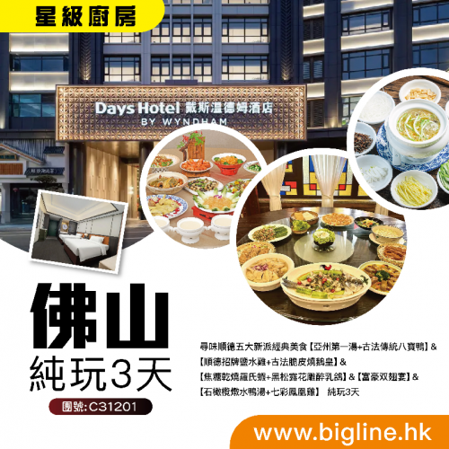 【星級廚房】大航假期X天悅集團X美食盛宴 港人口碑至讚<位上鮑汁8頭鮑魚+瑤柱花膠鳳凰羹><堂做仙鶴神針紅燒鴿吞佛跳牆>連住兩晚天悅集團豬肉婆旗下2026年1月全新開業【佛山柏希酒店】純玩3天