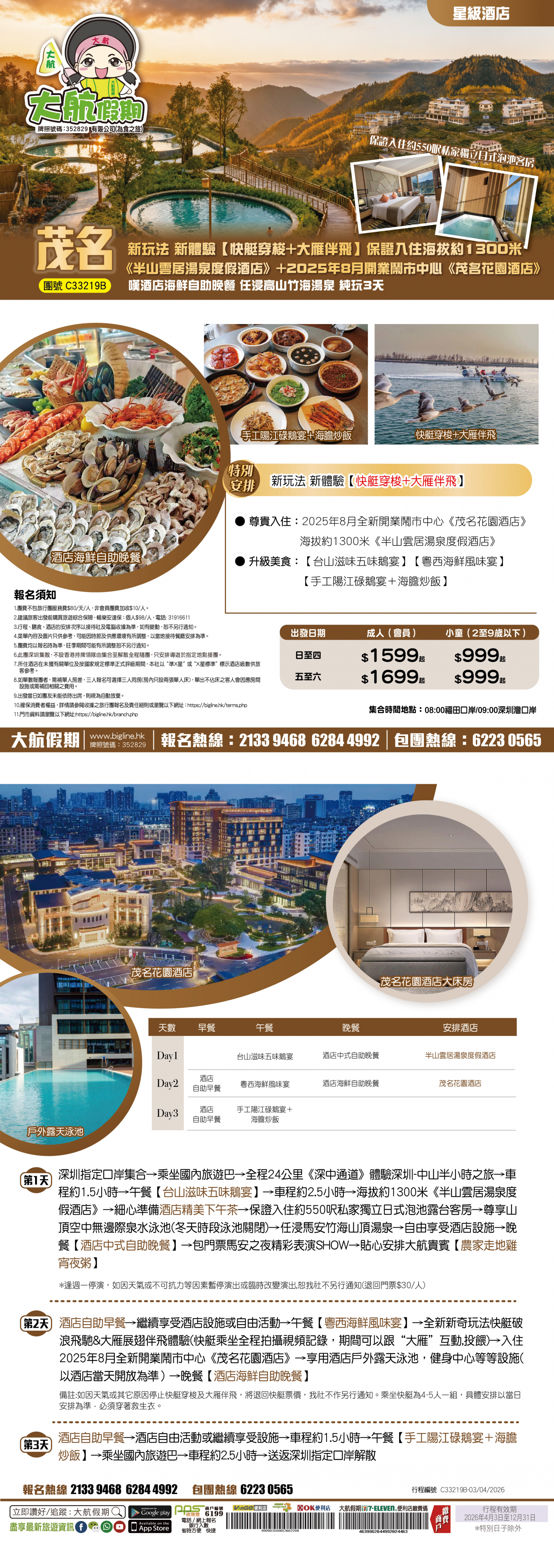 | 第1天 | 台山滋味五味鵝宴 | 酒店中式自助晚餐 | 半山雲居湯泉度假酒店 | |