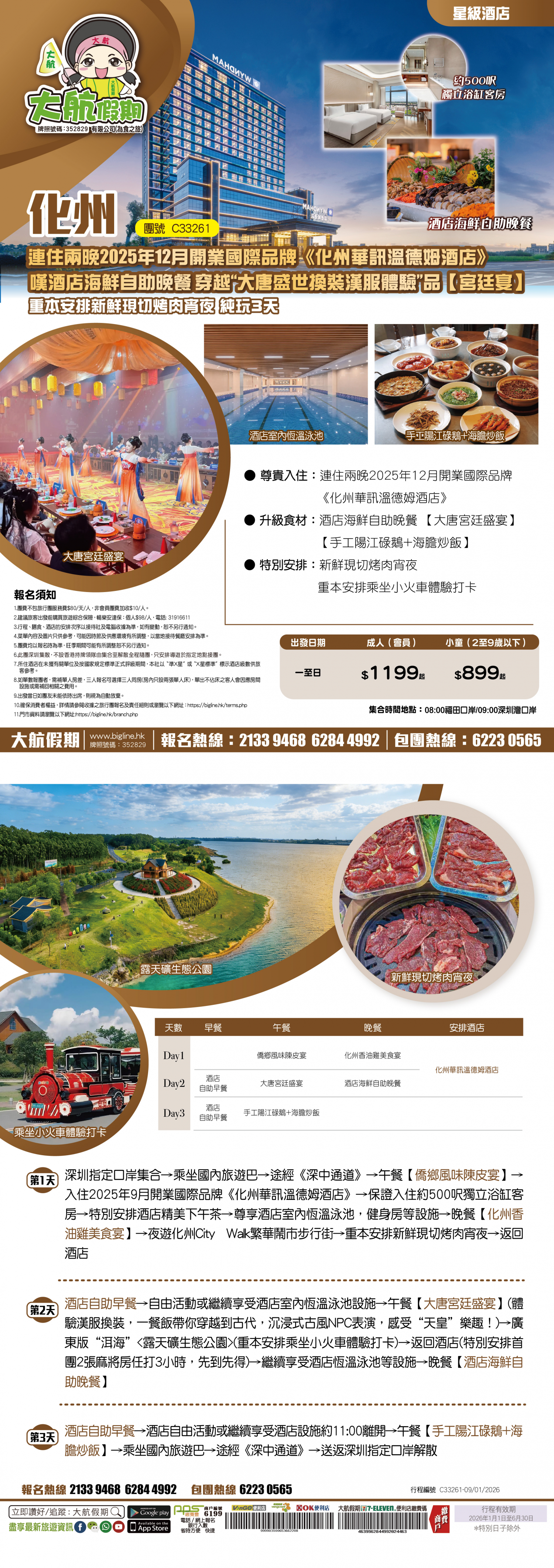 | 第1天 | 僑鄉風味陳皮宴 | 茂名隔水蒸雞美食宴 | 化州華訊溫德姆酒店 | |